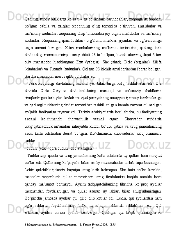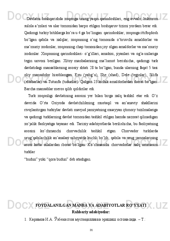 I BOB.  TURK XOQONLIGIGA OID MANBALAR VA XOQONLIGI