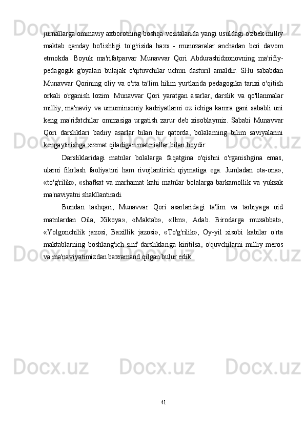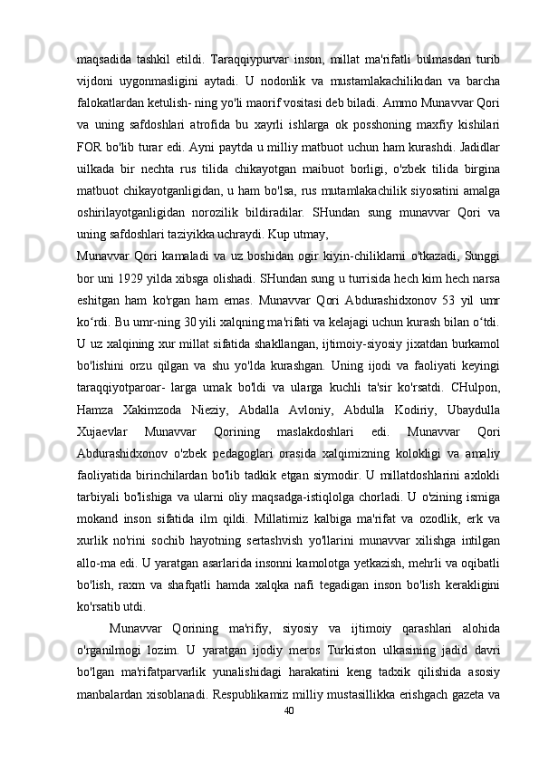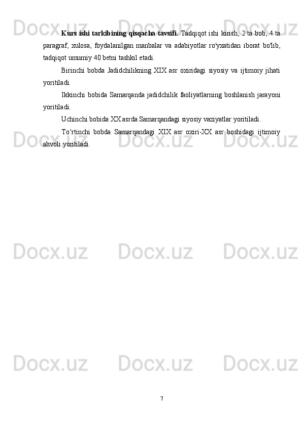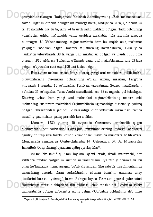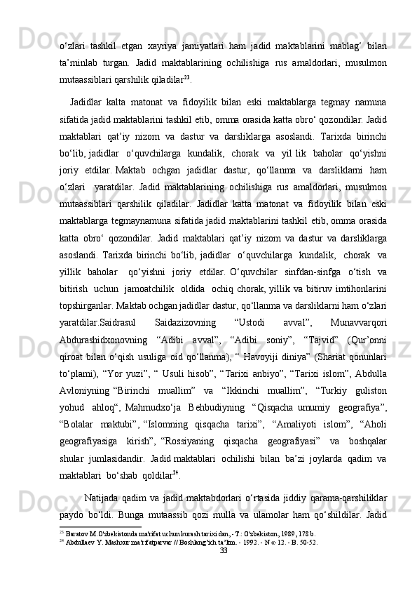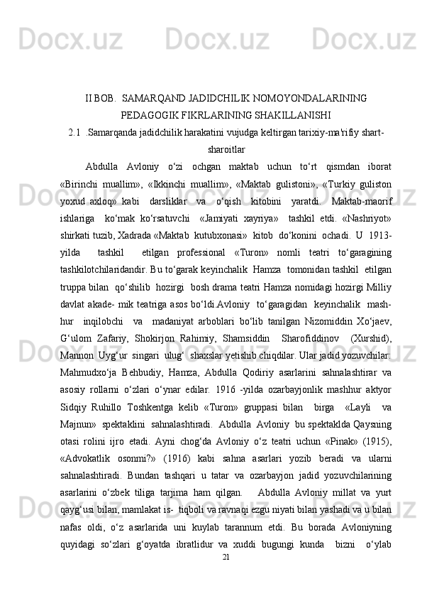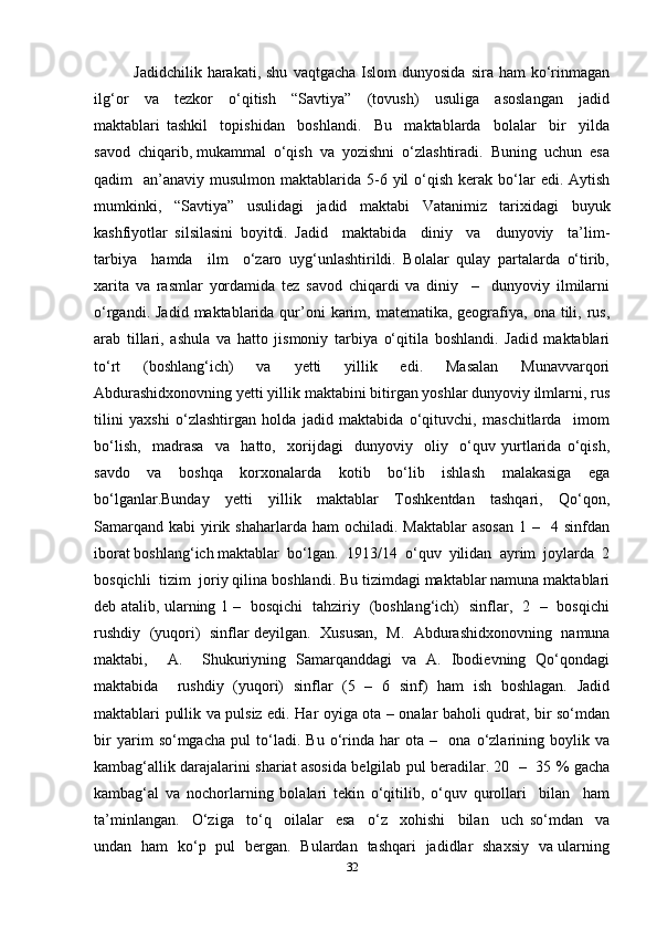 II BOB. SAMARQAND JADIDCHILIK NOMOYONDALARINING PEDAGOGIK FIKRLARINING SHAKILLANISHI………………………...19 2.1. Samarqanda jadidchilik harakatini vujudga keltirgan tarixiy-ma'rifiy shart-sharoitlar..................................................................................................................19