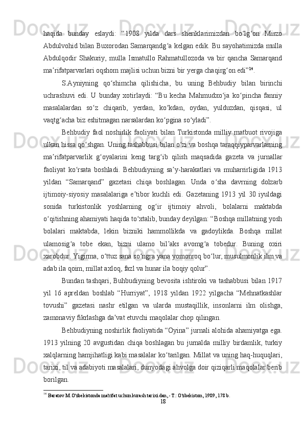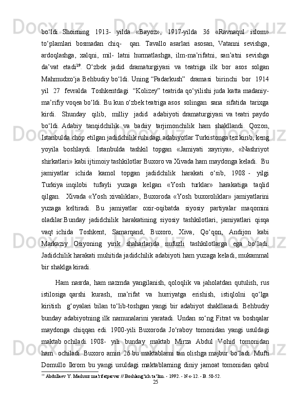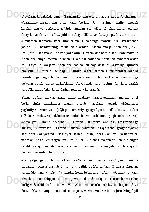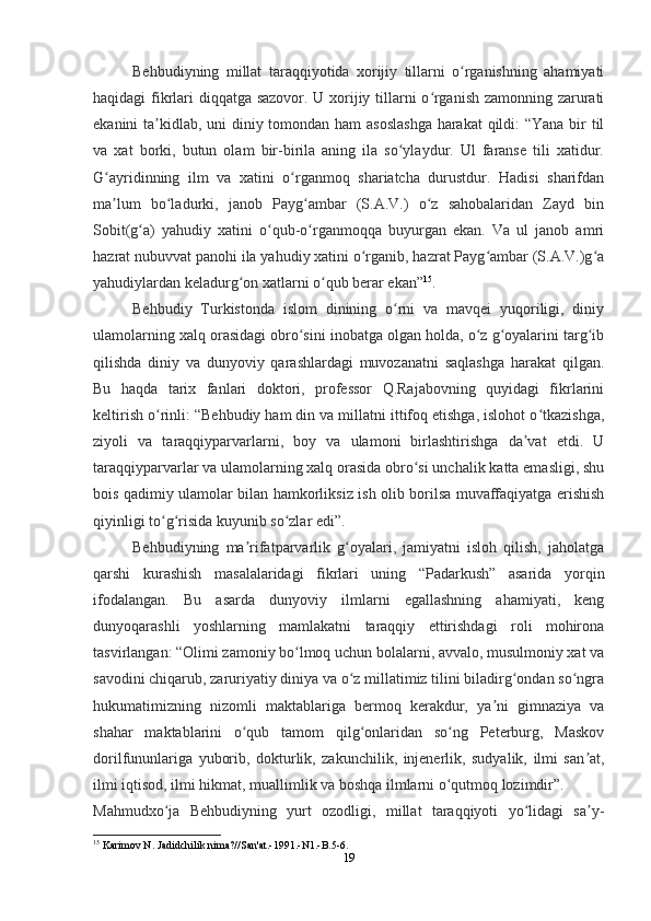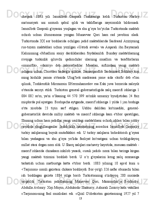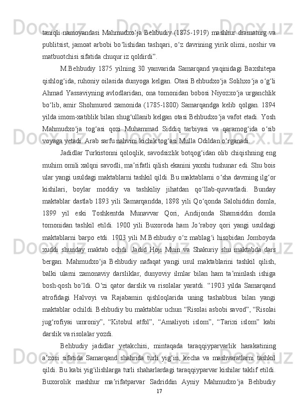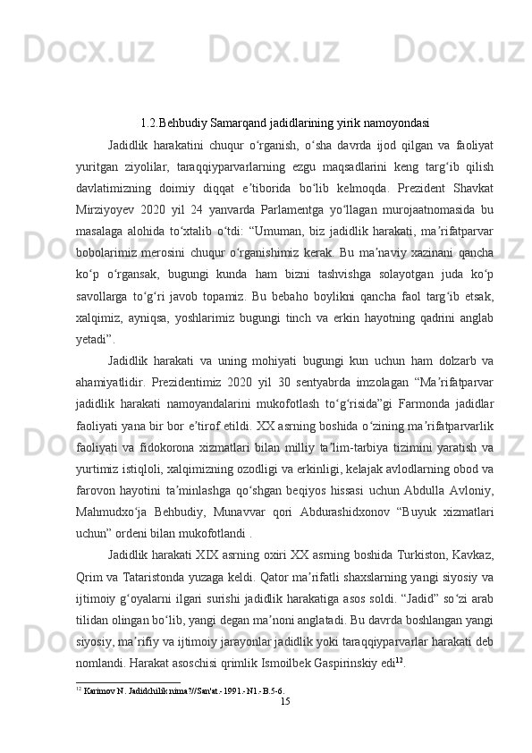 1.2.Behbudiy Samarqand jadidlarining yirik namoyondasi……………………….13
