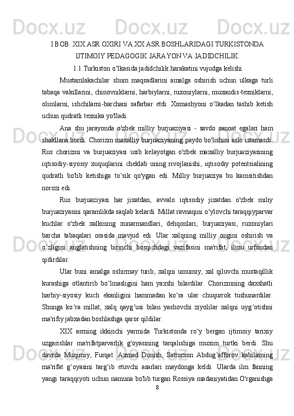 I BOB. XIX ASR OXIRI VA XX ASR BOSHLARIDA TURKISTONDA IJTIMOIY-PEDAGOGIK JARAYON VA JADIDCHILIK………….……….6