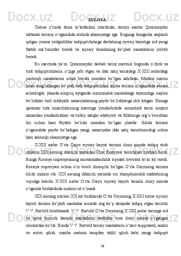 Xulosa   o‘rnida   shuni   ta’kidlashni   istardimki,   tarixiy   asarlar   Qoraxoniylar