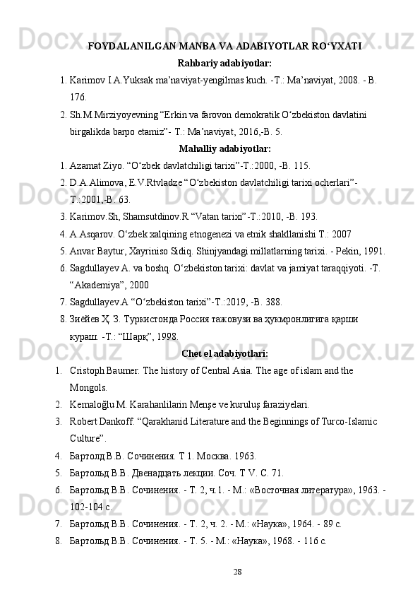 Sagdullayev A. va boshq. O‘zbekiston tarixi: davlat va jamiyat taraqqiyoti. –T. “Akademiya”, 2000