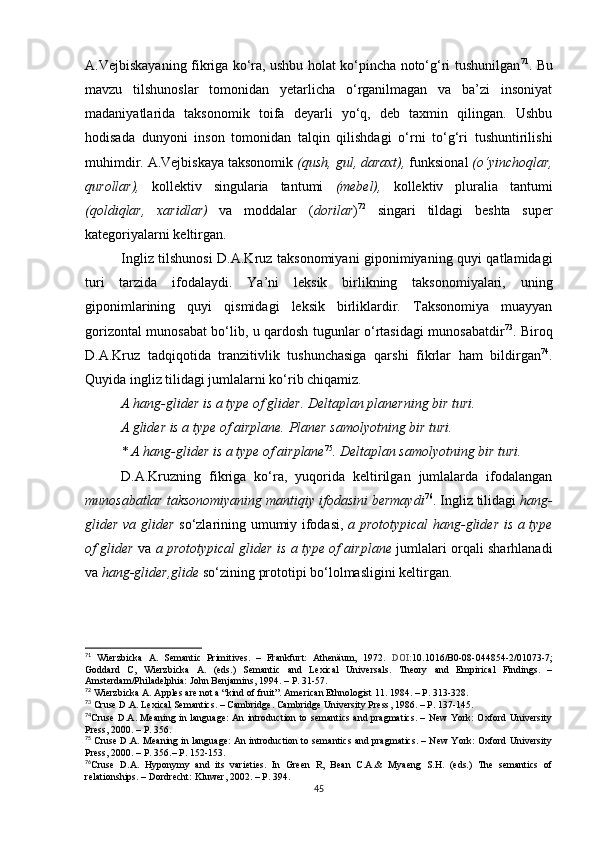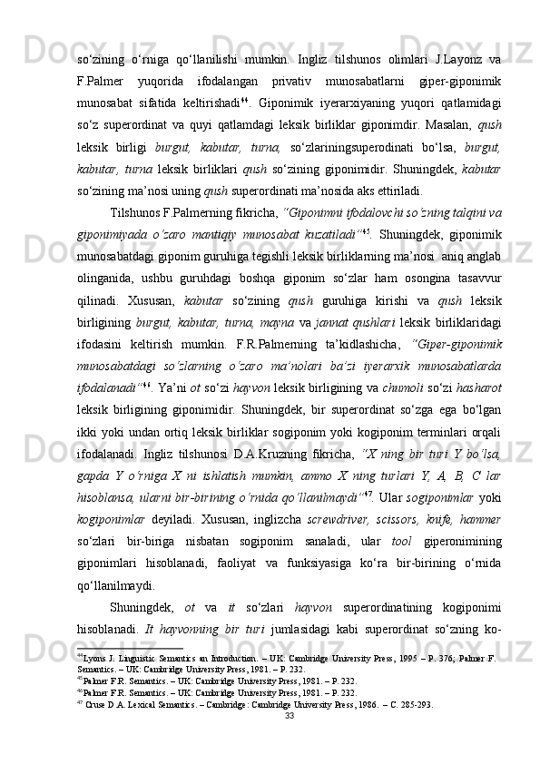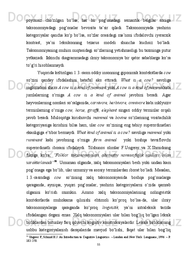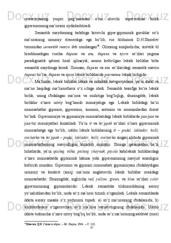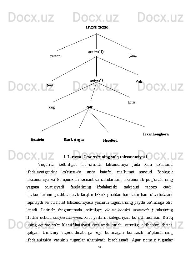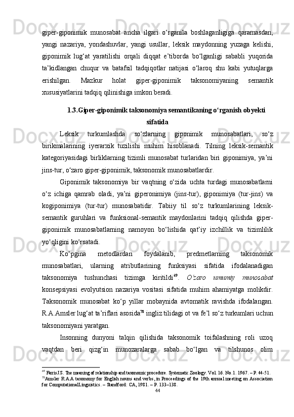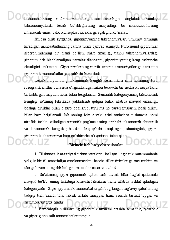 1.3.Giper-giponimik taksonomiya semantikaning o‘rganish obyekti sifatida......................................................................................................44-56