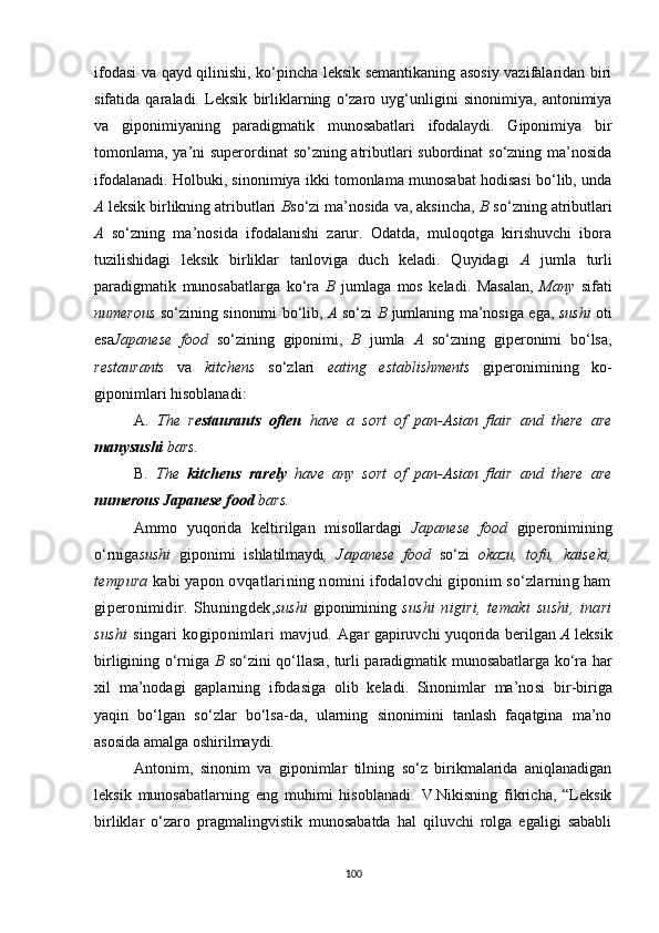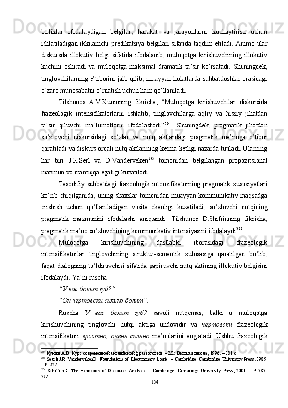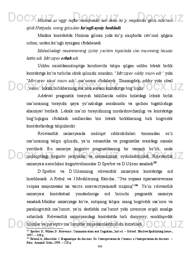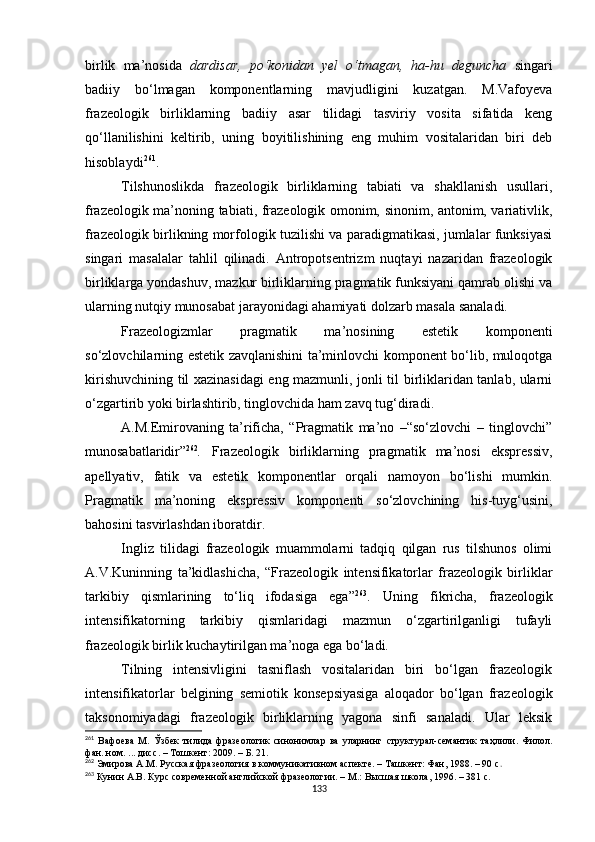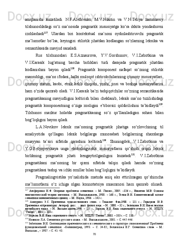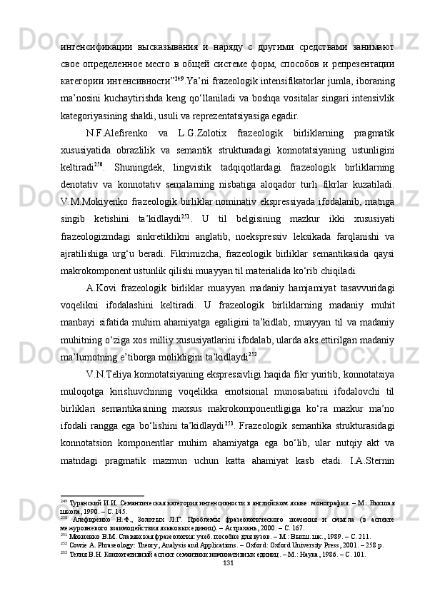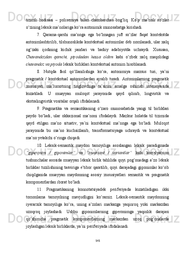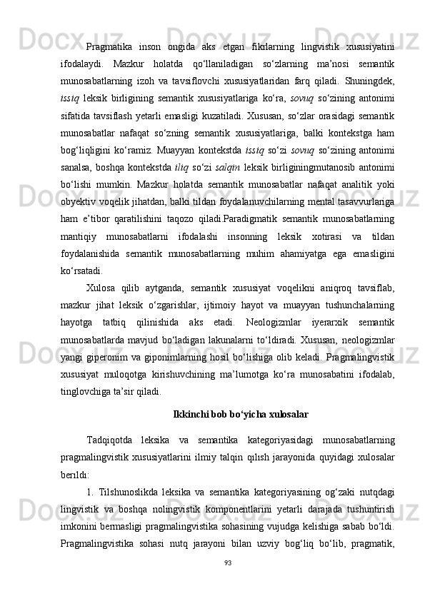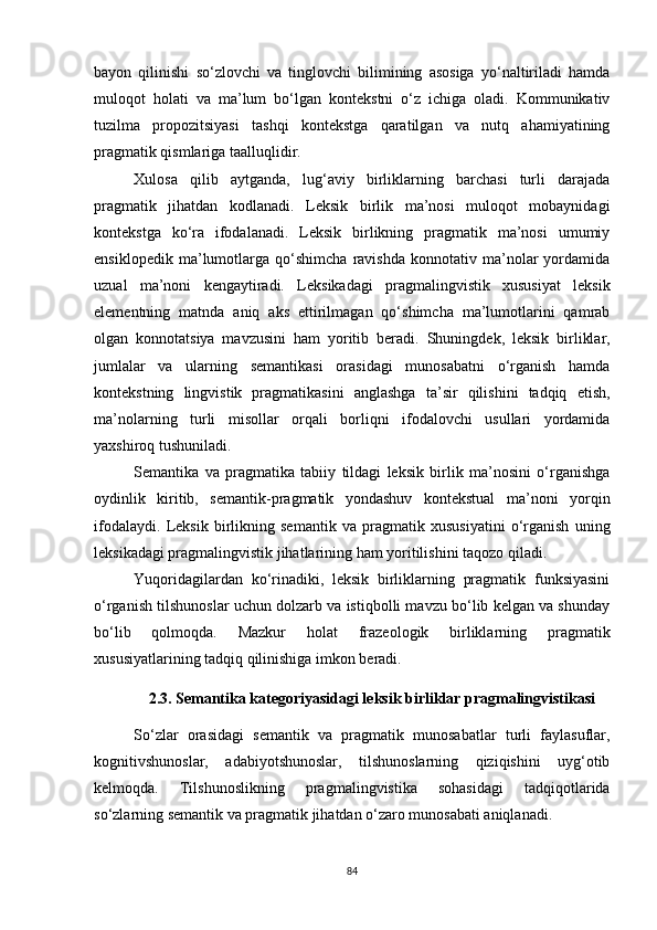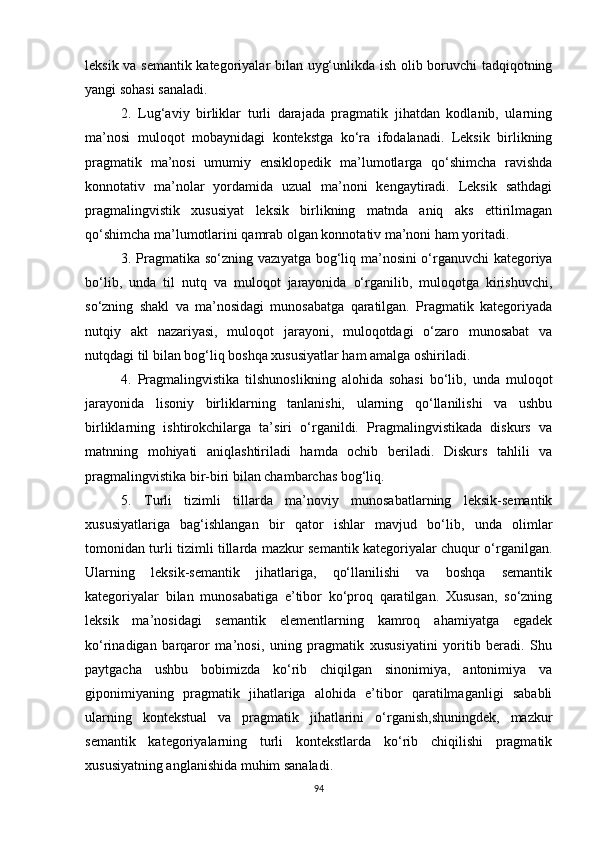 2.3 Semantika kategoriyasidagi leksik birliklar pragmalingvistikasi......85-94