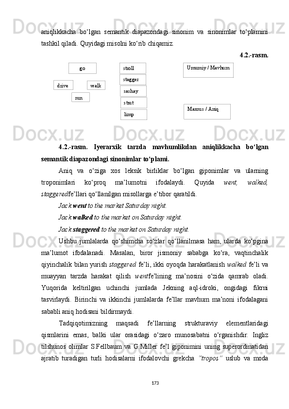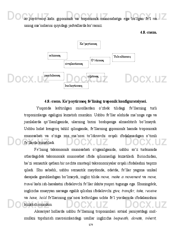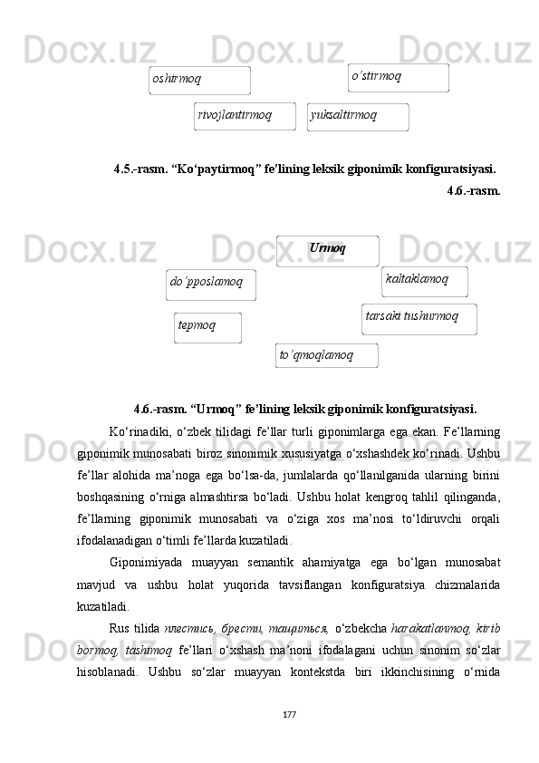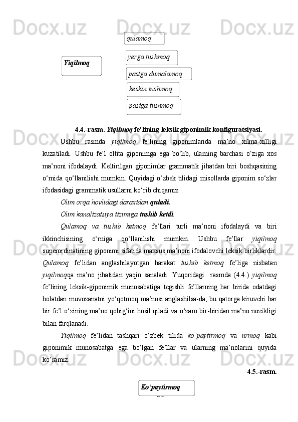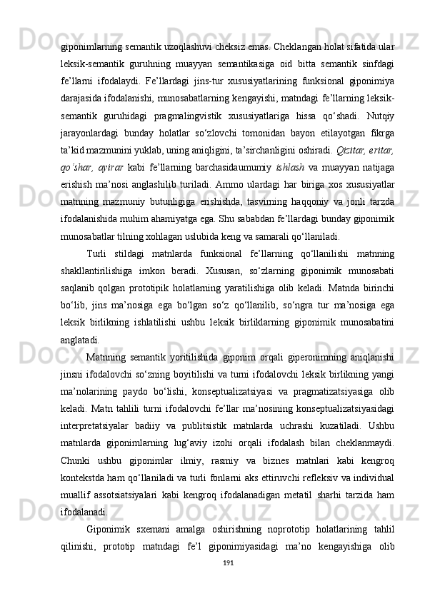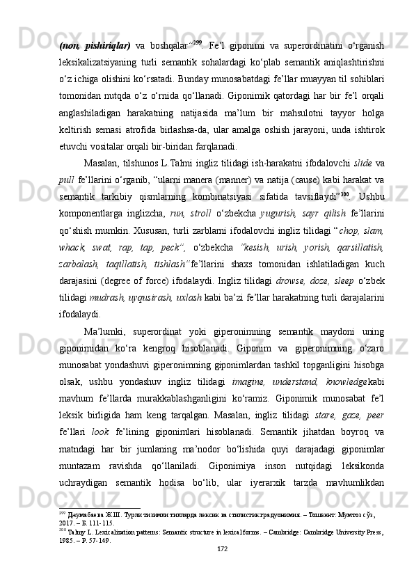 4.4. Fe’l soʻz turkumiga oid leksik birlik giper-giponimik munosabatlarining pragmalingvistik xususiyatlari.............................................................171-194