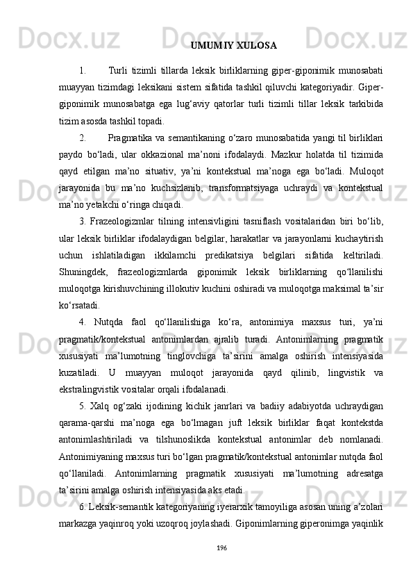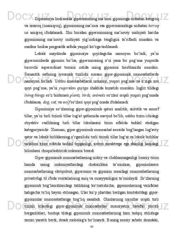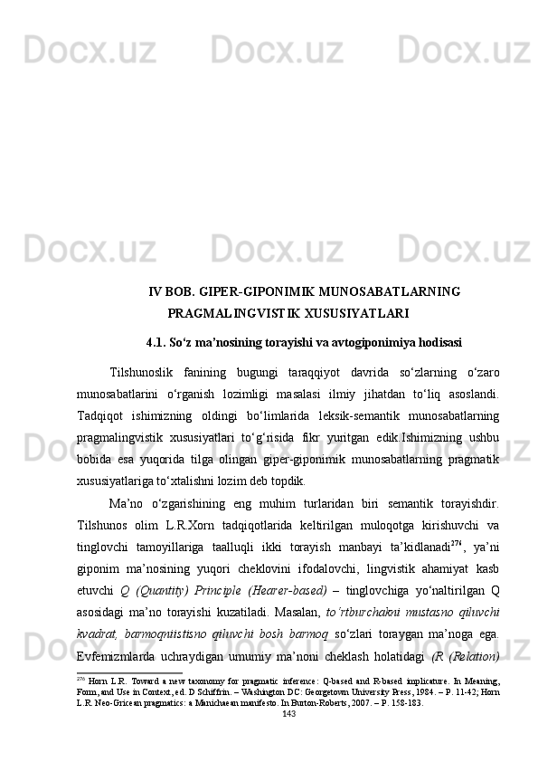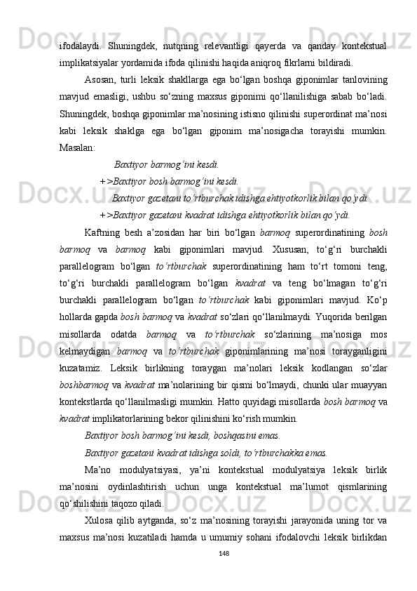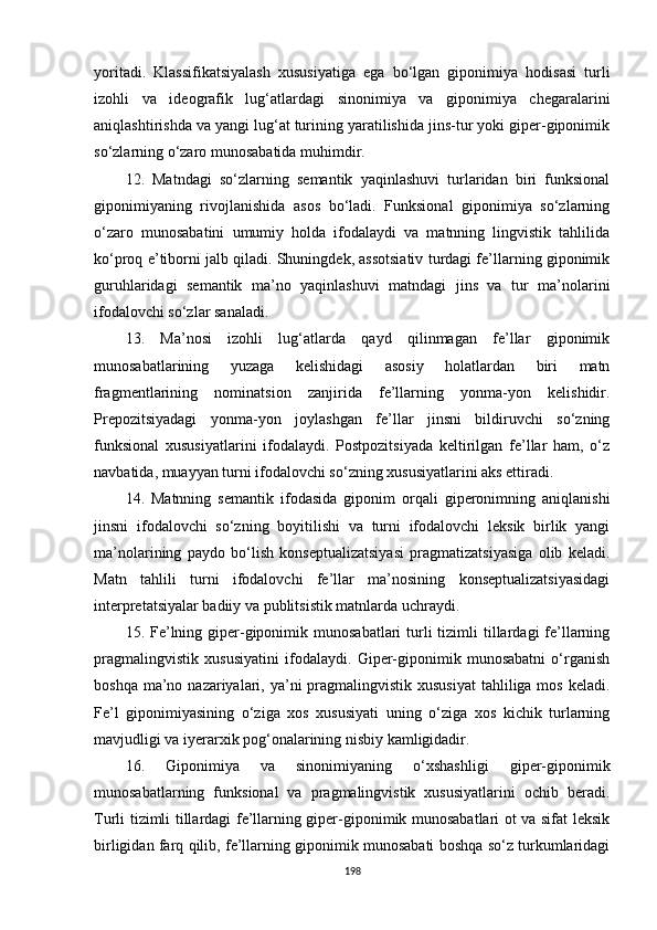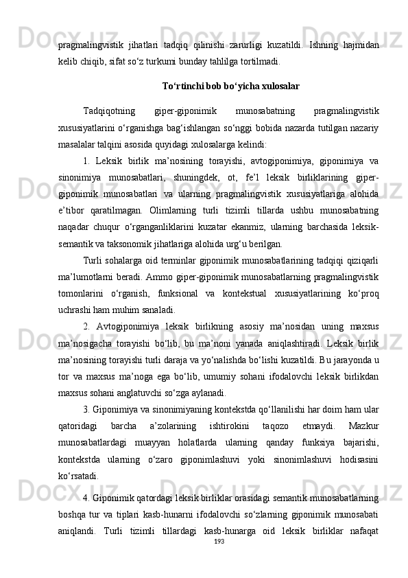 IV BOB. GIPER-GIPONIMIK MUNOSABATLARNING PRAGMALINGVISTIK XUSUSIYATLARI…………………………...144-197