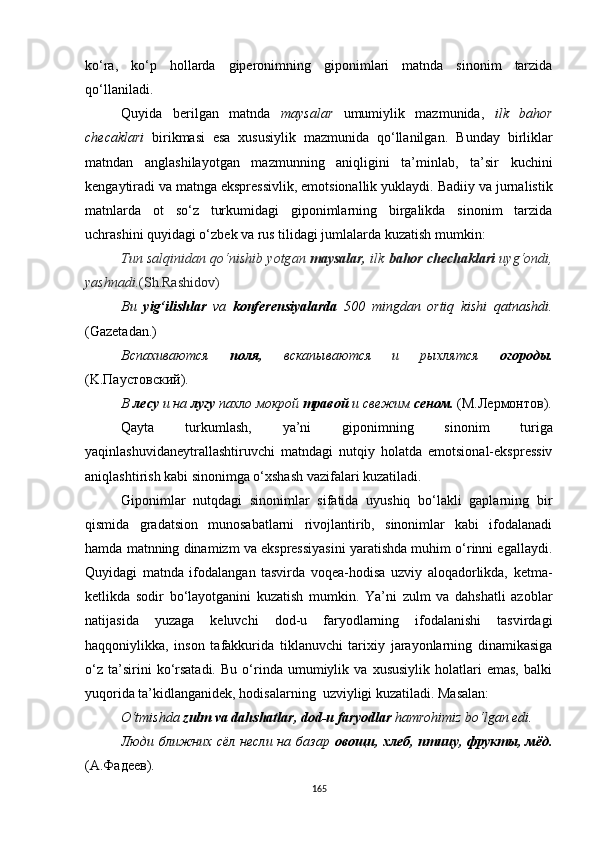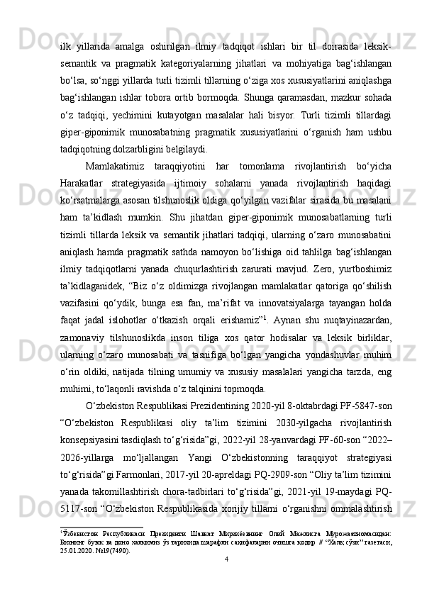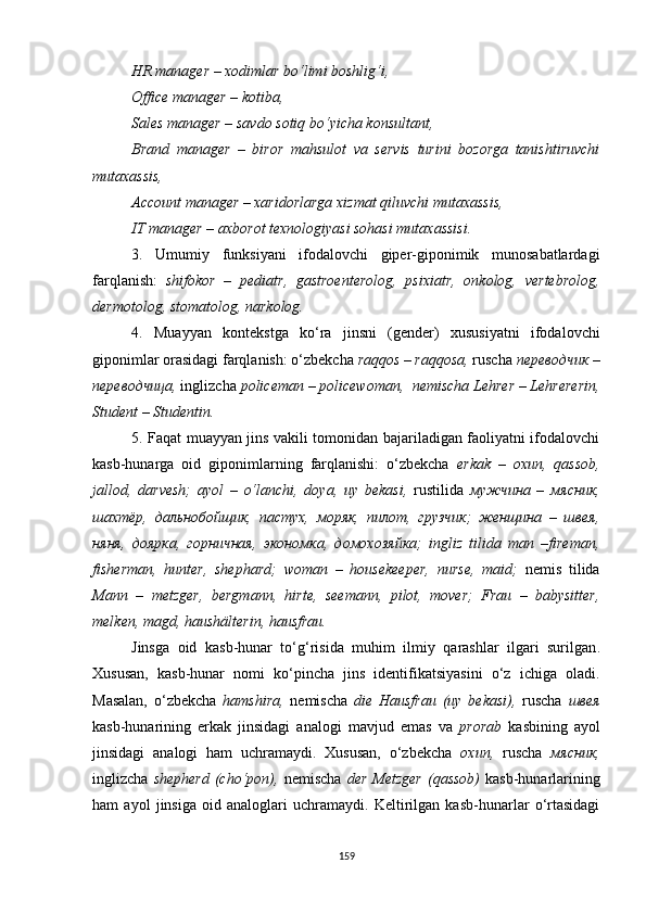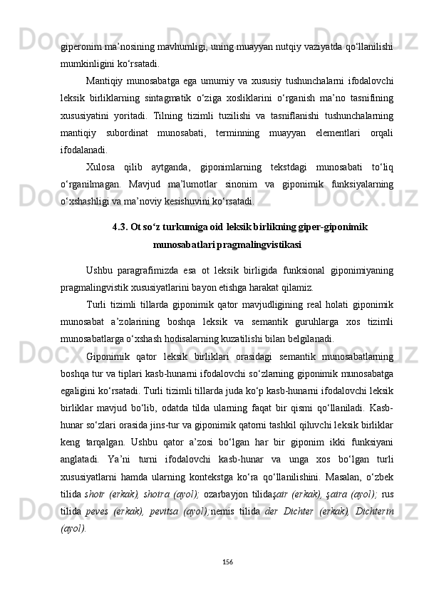 4.3. Ot soʻz turkumiga oid leksik birlikning giper-giponimik munosabatlari pragmalingvistikasi…………………………………………………..157-171