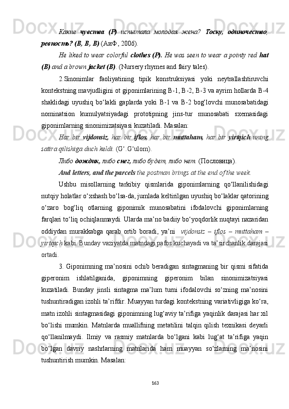III BOB. TURLI TIZIMLI TILLARDA PARADIGMATIK MUNOSABATGA OID SOʻZLAR VA FRAZEOLOGIZMLARDA GIPONIMIK MUNOSABATLAR PRAGMATIKASI….……………….96-143