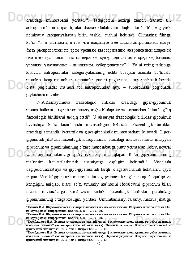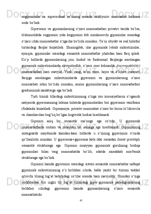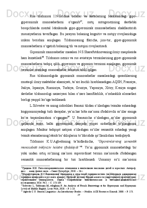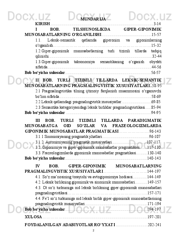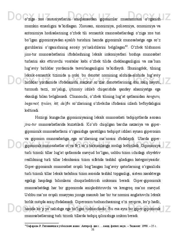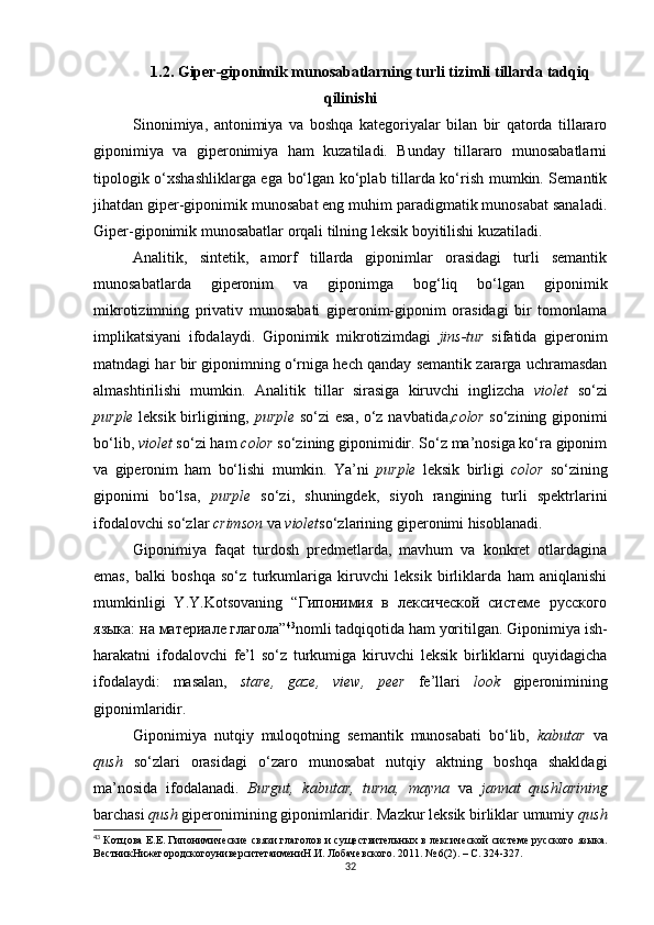1.2.Giper-giponimik munosabatlarning turli tizimli tillarda tadqiq qilinishi.....................................................................................................32-44