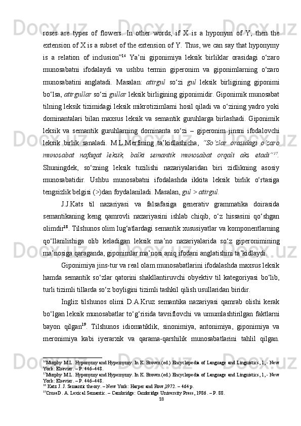 1.1. Leksik-semantik qatlamda giperonim va giponimlarning o‘rganilish………………………………………………………………15-32