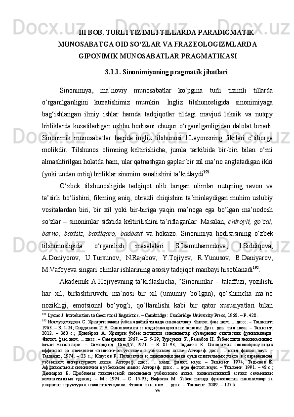3.1.1 Sinonimiyaning pragmatik jihatlari..............................................96-107