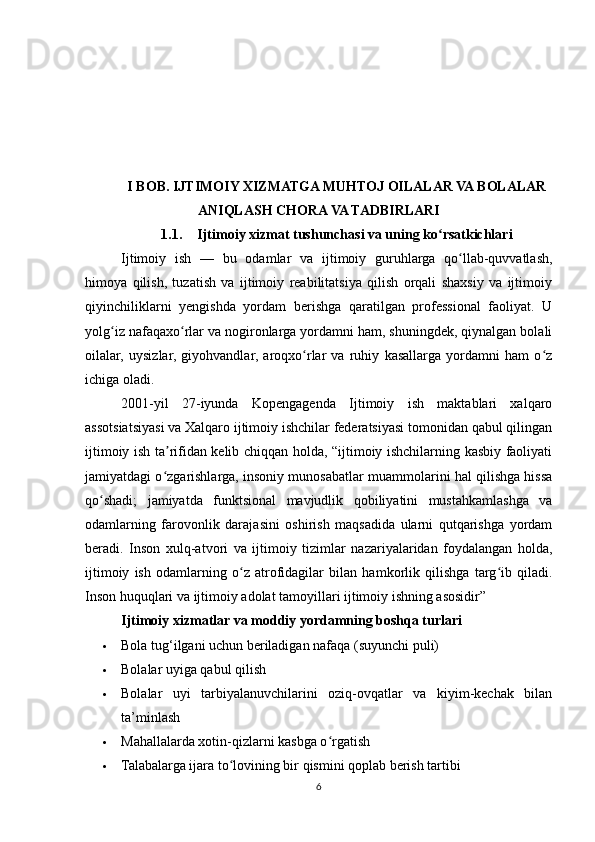 I BOB. IJTIMOIY XIZMATGA MUHTOJ OILALAR VA BOLALAR ANIQLASH CHORA VA TADBIRLARI