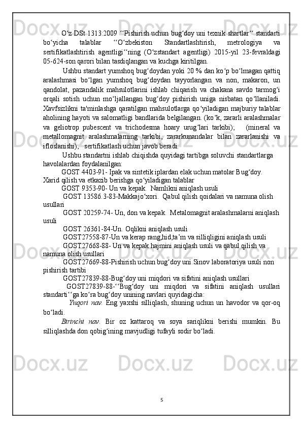 UN VA NON MAHSULOTLARINI TAYYORLASHDA FOYDALANILADIGAN XOMASHYOLAR VA ULARGA QOʻYILADIGAN TALABLAR