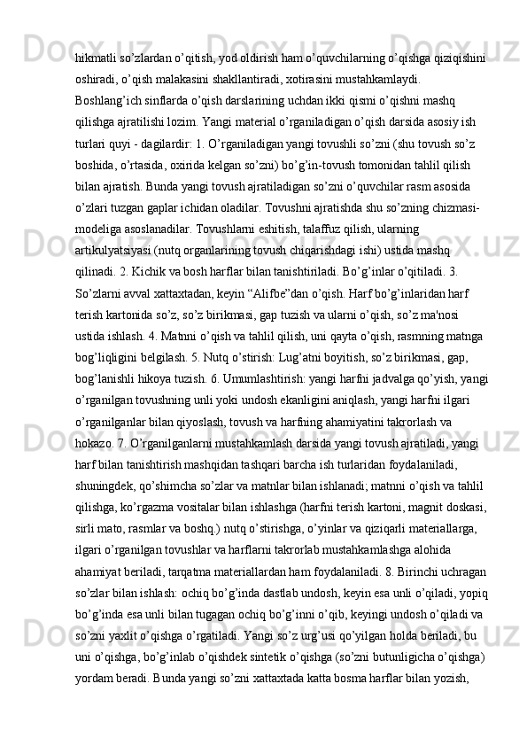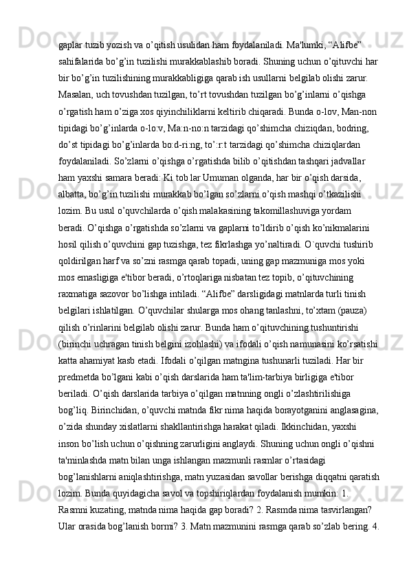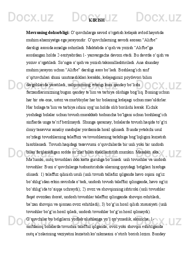 UNLI VA UNDOSH TOVUSHLARNI O’RGANISHDA LEKSIK MASHQLARNI TASHKIL ETISH