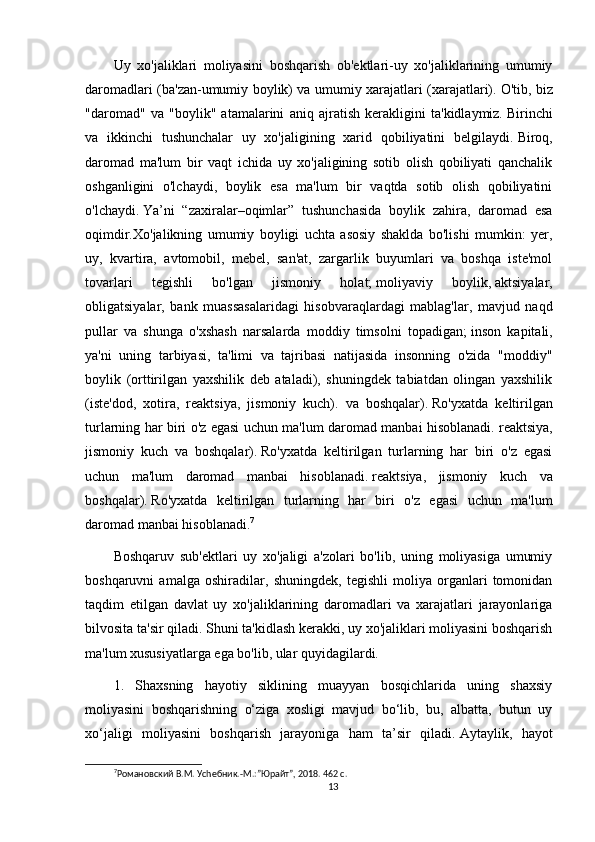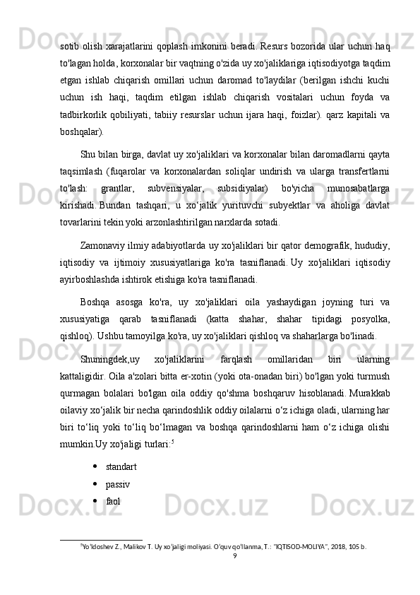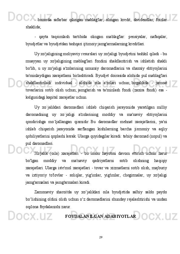 6. Yo‘l dosh e v   Z .,   Malikov   T.   Uy   x o‘ jaligi   moliyasi.   O‘q uv   qo‘ llanma,   T .: