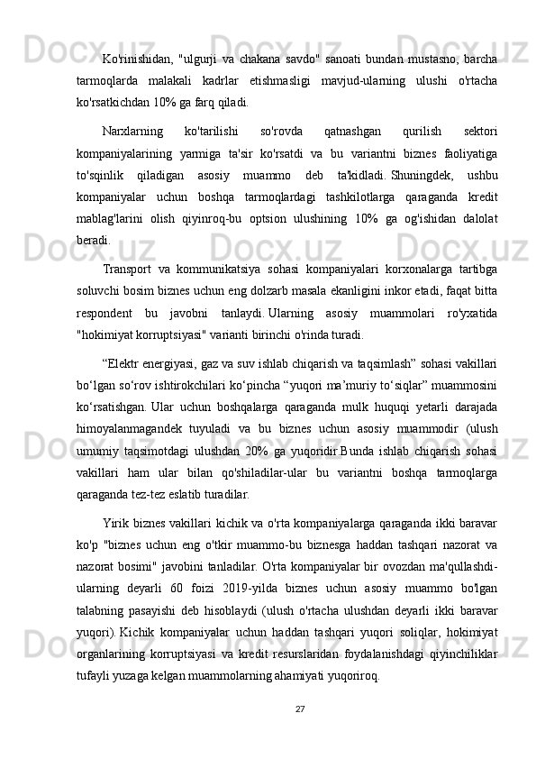27,9%   respondentlar   tomonidan   2019-yilda   biznes   uchun   asosiy   muammo