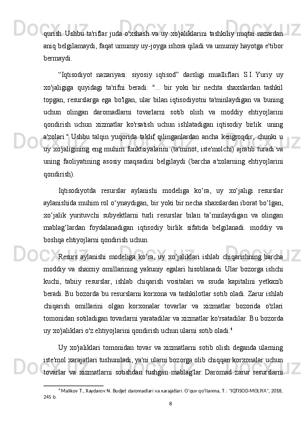 Uy   xo'jaligini   iqtisodiyot   va   jamiyatning   alohida   instituti   sifatida   ko'rib
