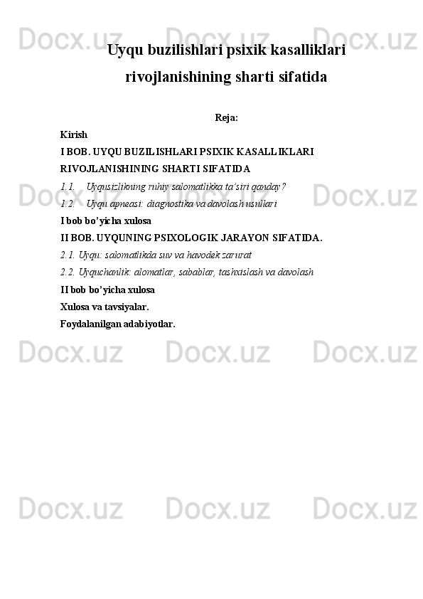 I BOB. UYQU BUZILISHLARI PSIXIK KASALLIKLARI RIVOJLANISHINING SHARTI SIFATIDA