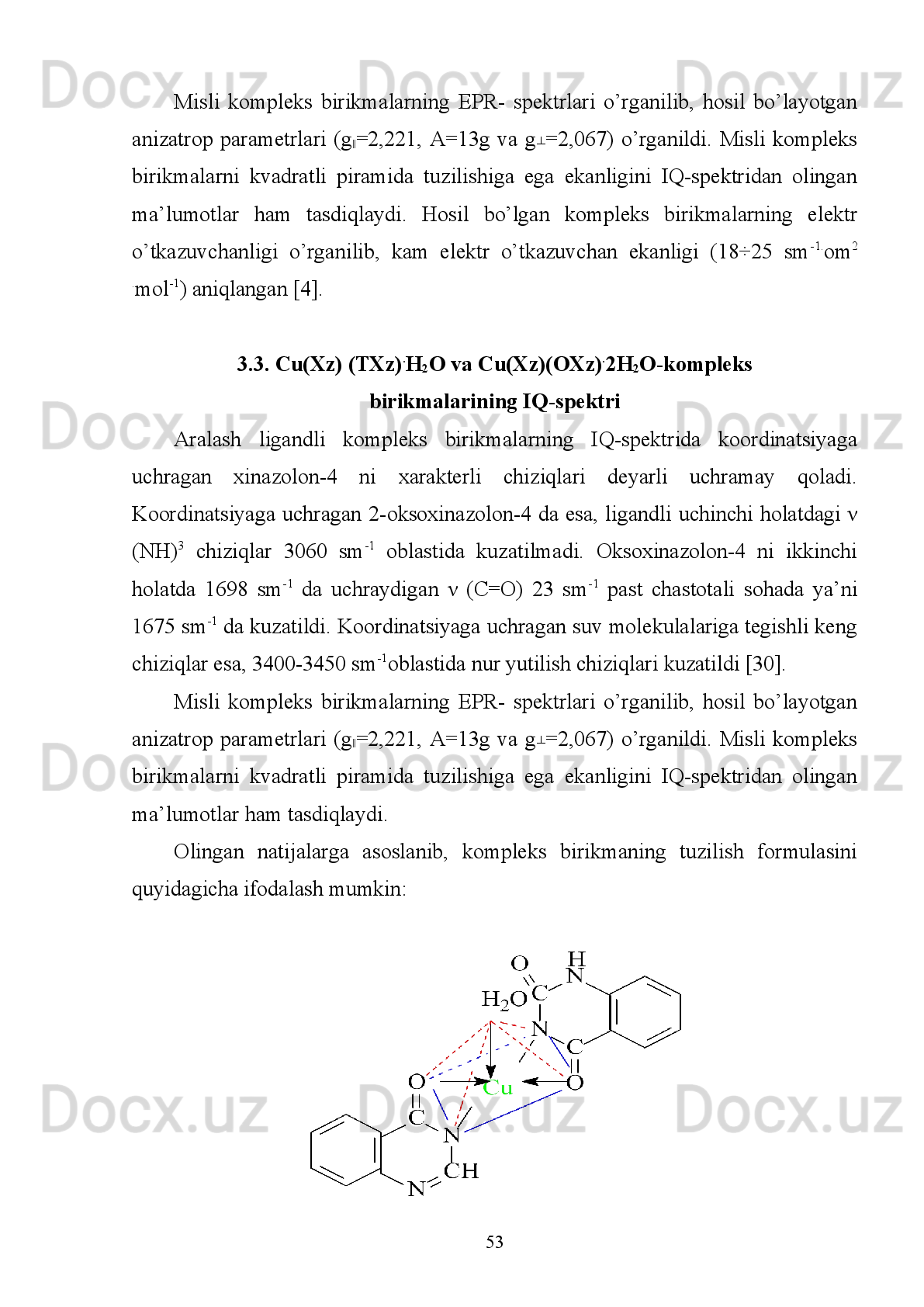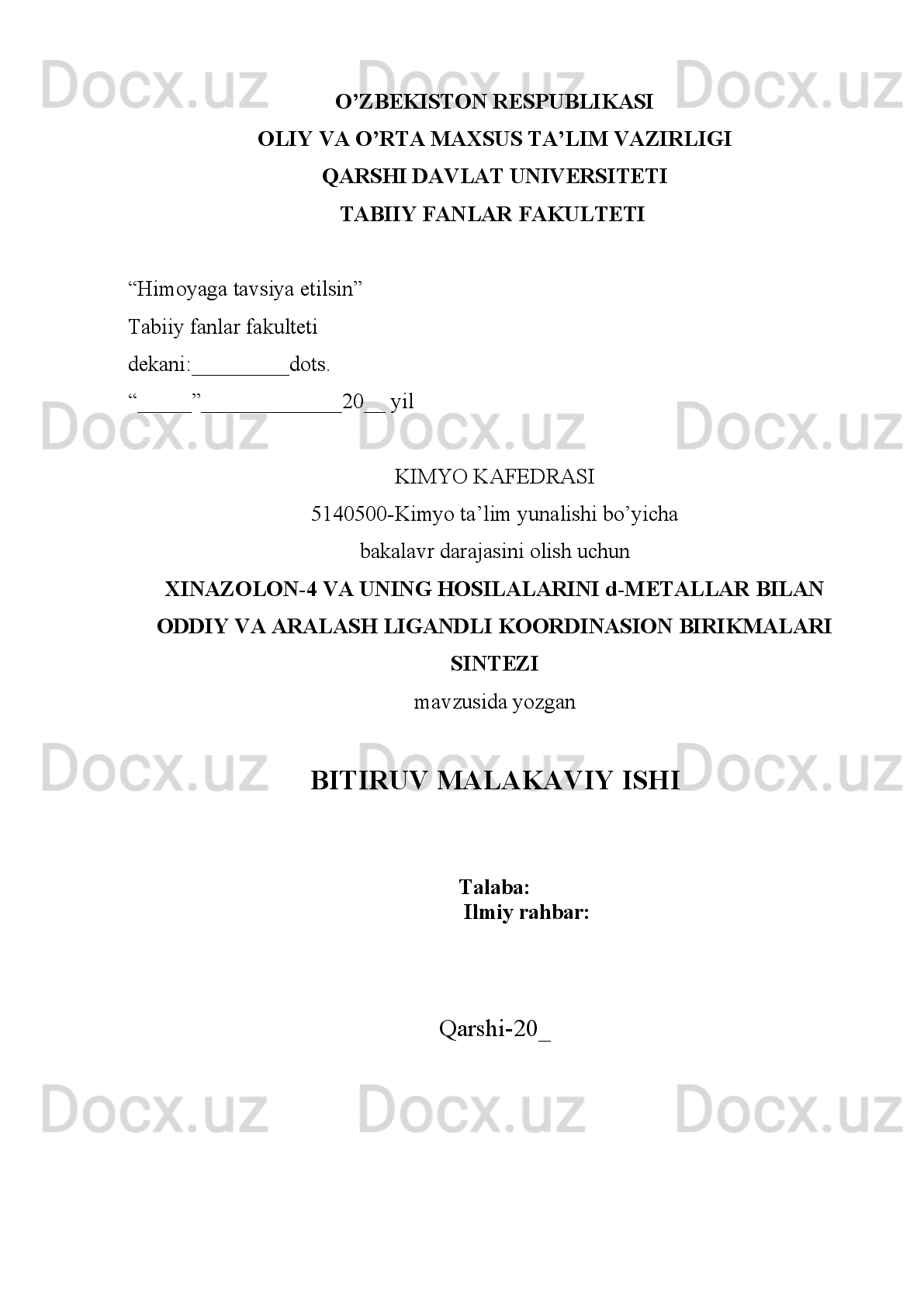 Xinazolon-4 va uning hosilalarini d-metallar bilan oddiy va aralash ligandli koordinasion birikmalari sintezi