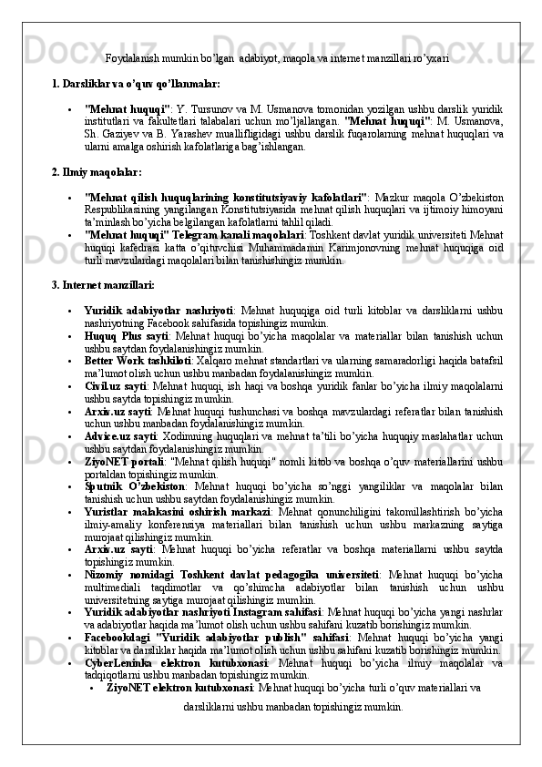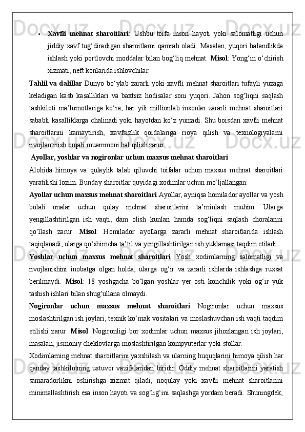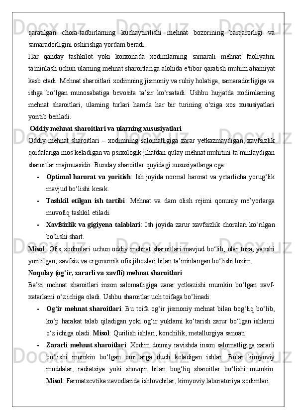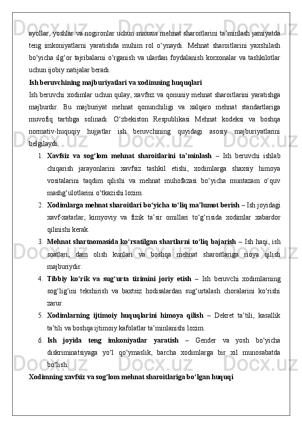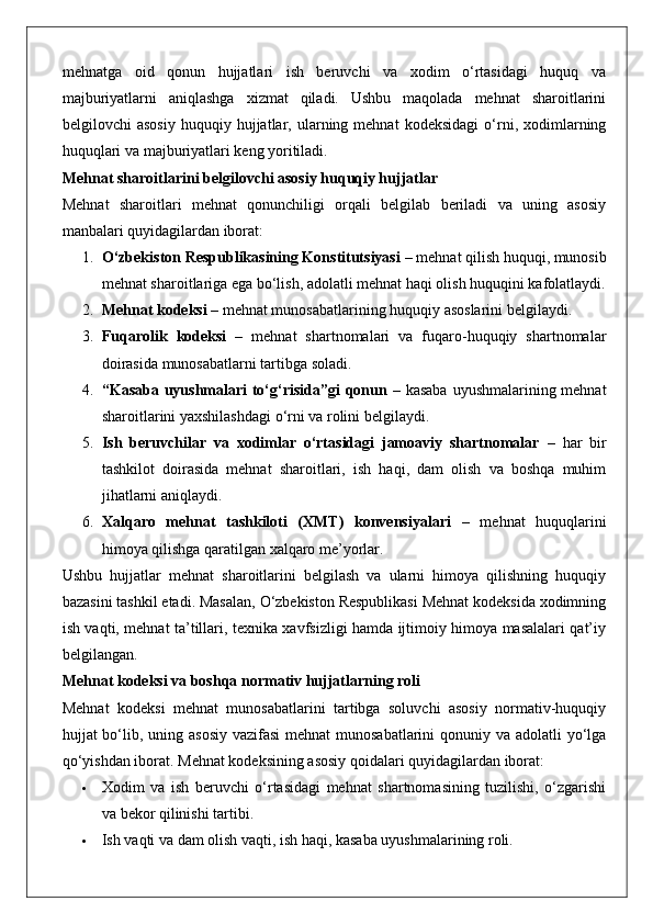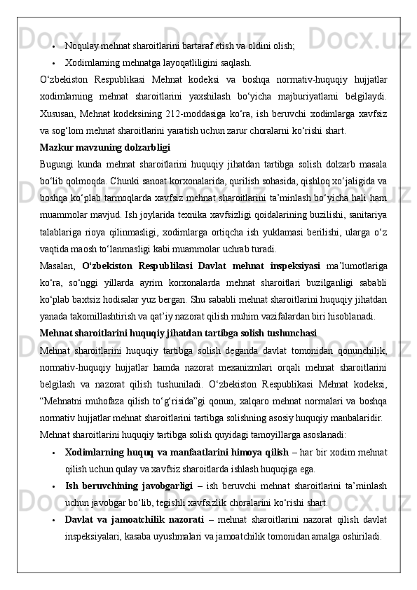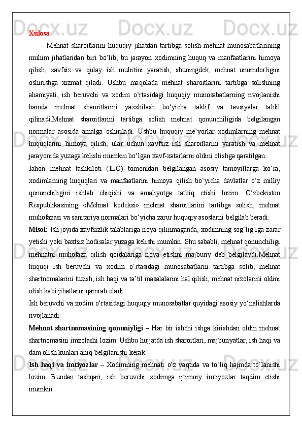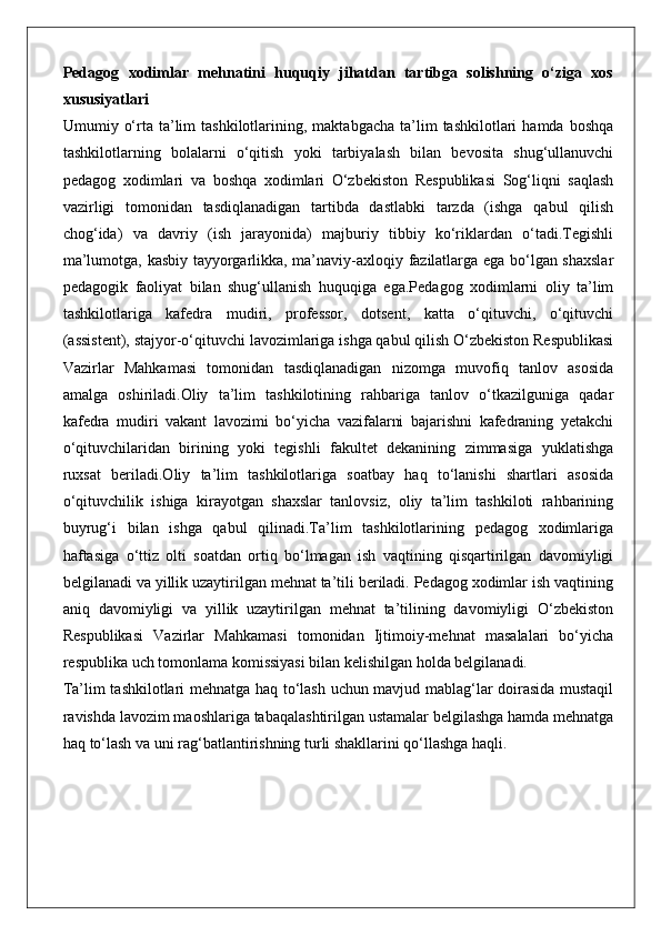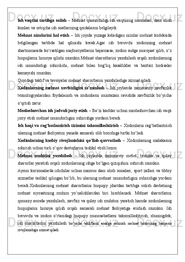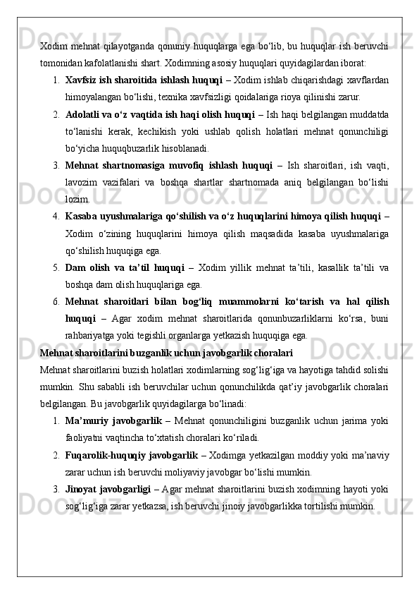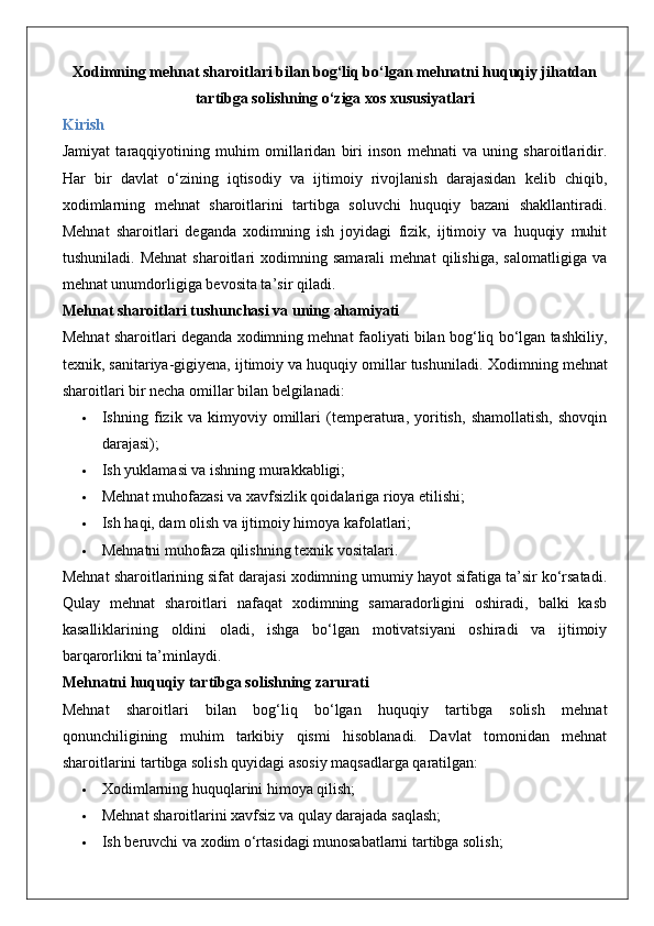 Xodimning mehnat sharoitlari bilan bog’liq bo’lgan mehnatni huquqiy jihatdan tartibga solishning o’ziga xos xususiyatlari 25