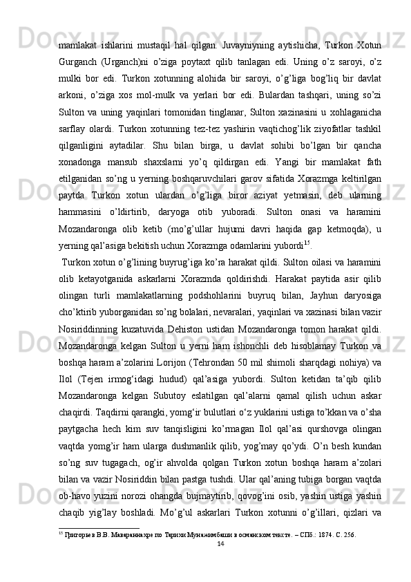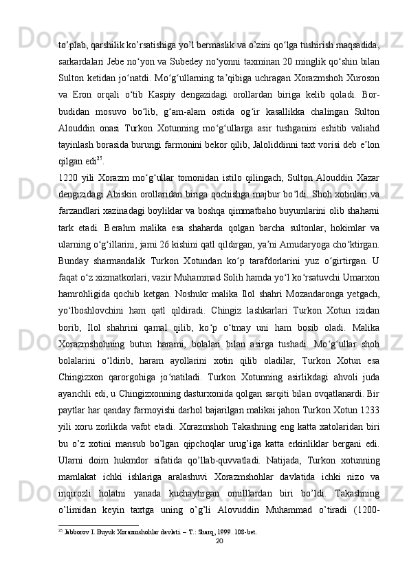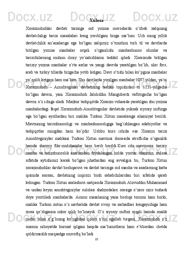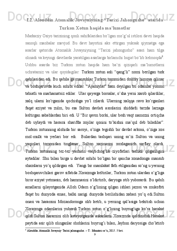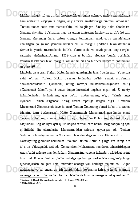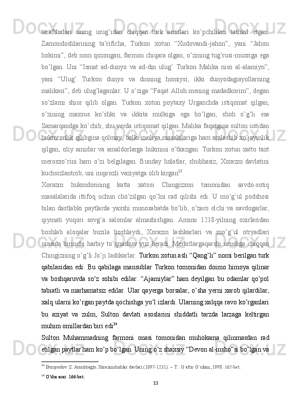Xorazmshohlar malikasi Turkon Xotunning davlat boshqaruvida tutgan o’rni tarixi yoritlgan asarlarning tahlili