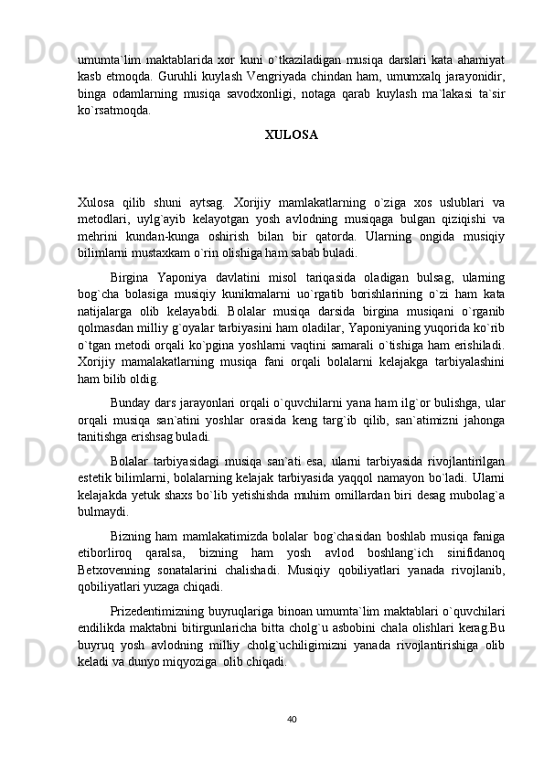 xorijiy mamlakatlarda musiqiy tarbiyaning o'ziga xos xususiyatlari