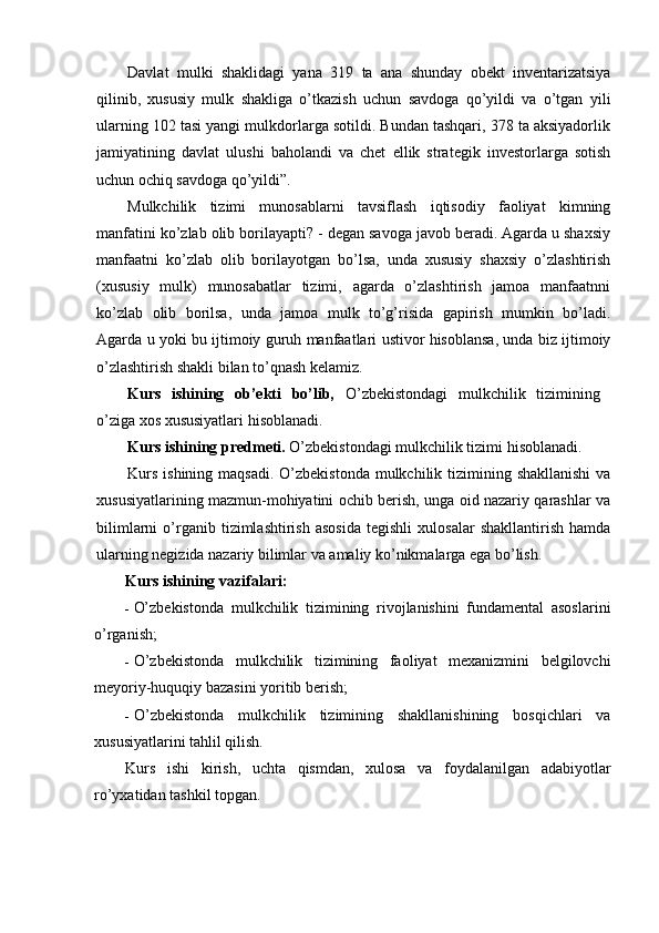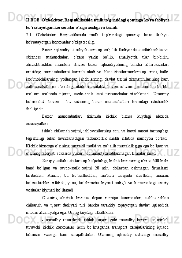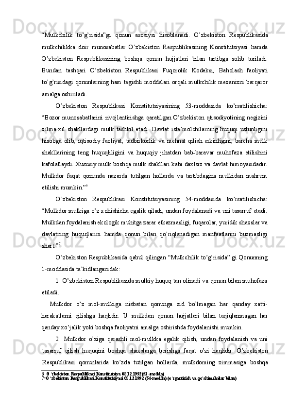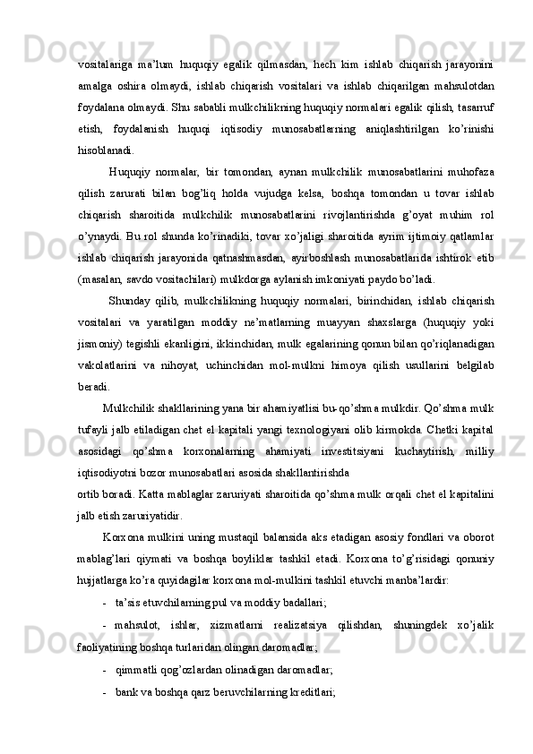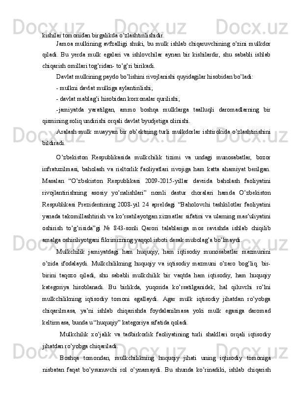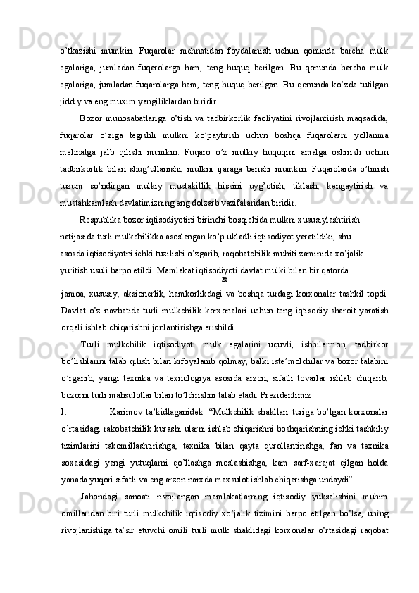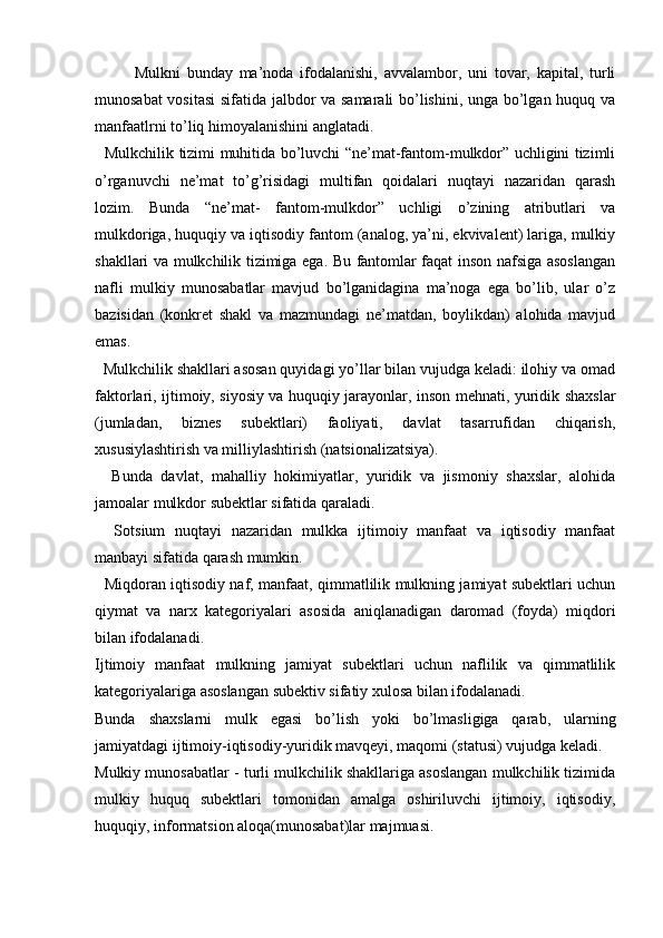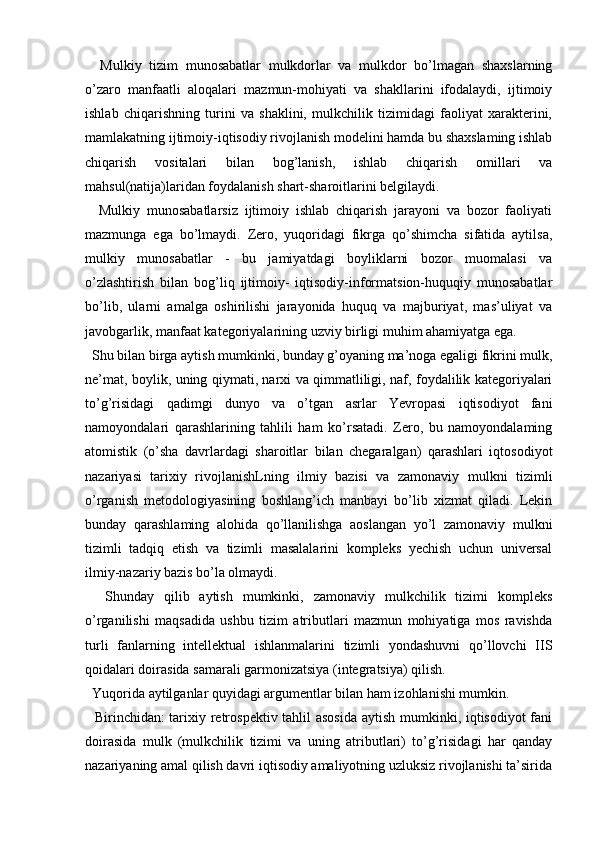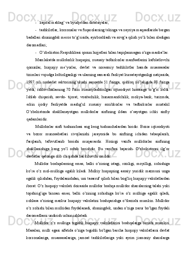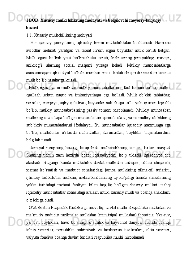 Xususiy mulkchilikning mohiyati va O’zbekistonda uni rivojlantirish muammolari