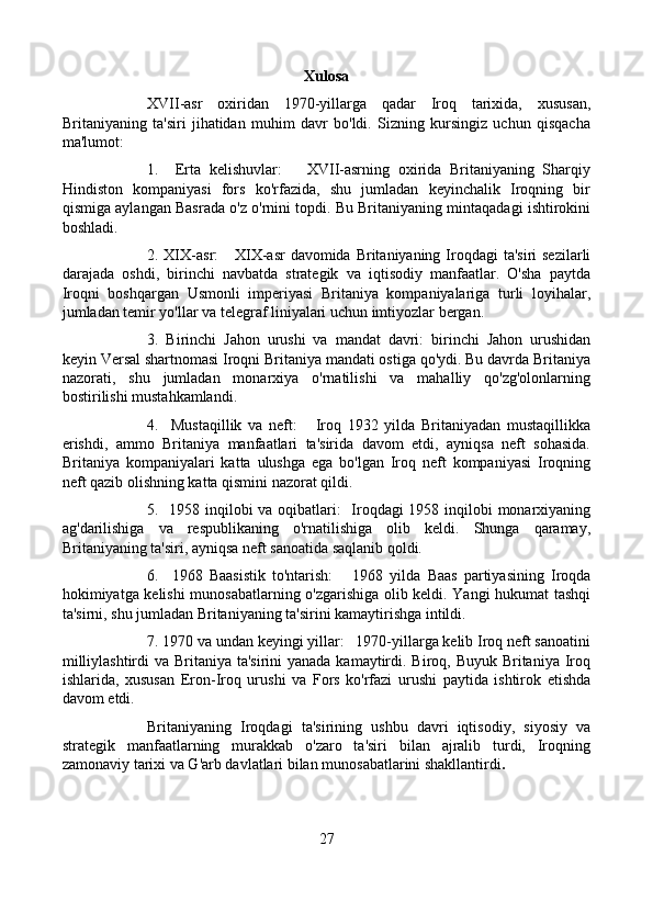 qismida XVII asr oxiridan XX asrning 70-yillariga qadar Iroqda Angliya tasiri  haqida