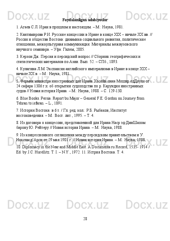Кулагина Л.М. Экспансия английского имперализма в Иране в конце XIX – начале XX в. – М.: Наука, 1981.