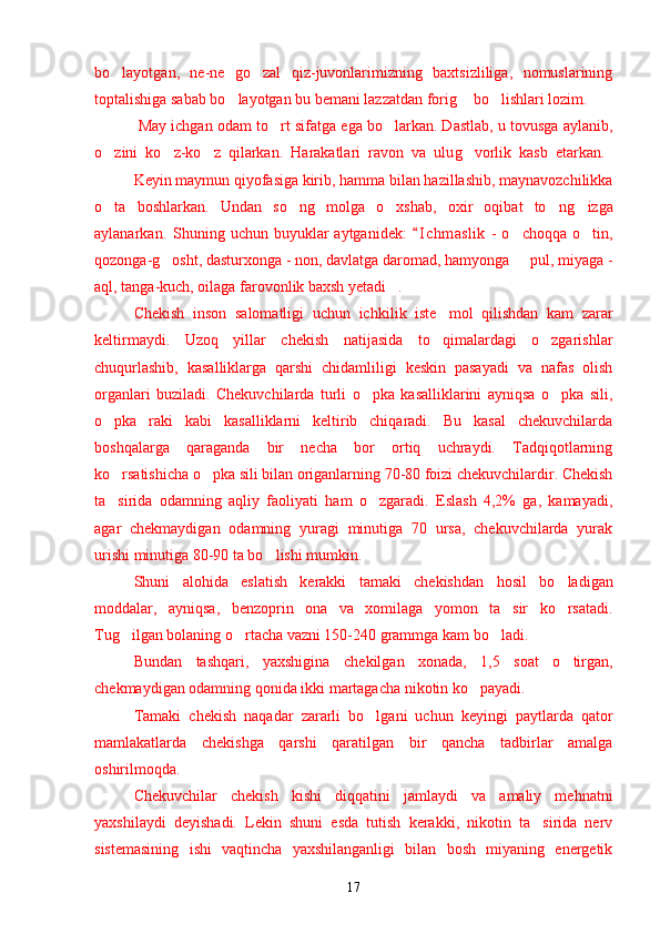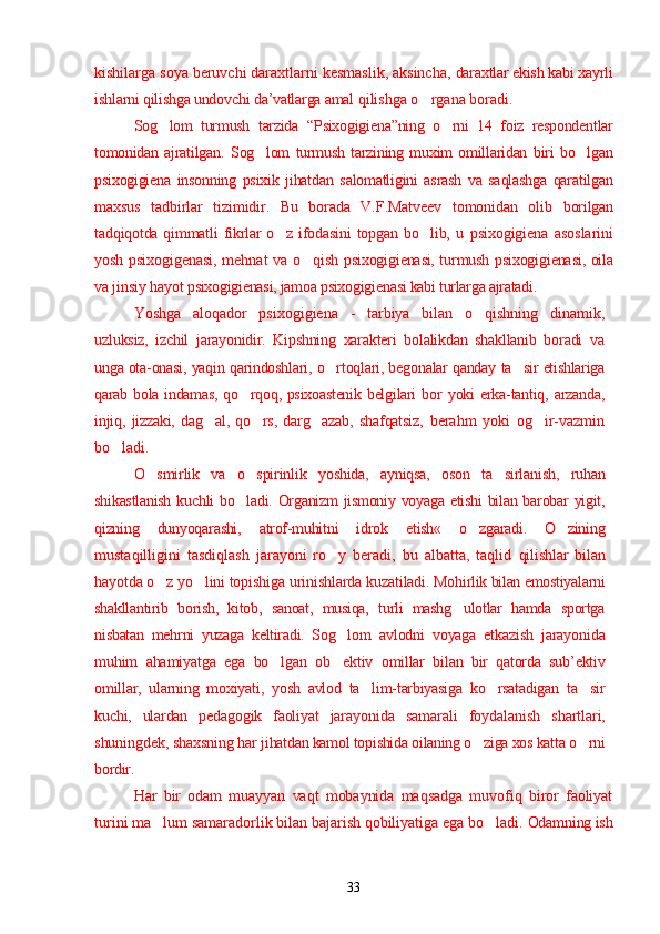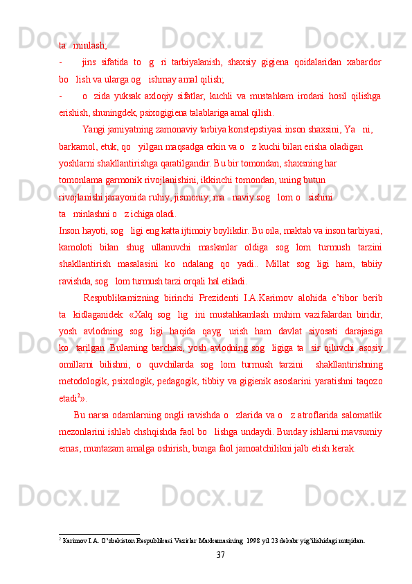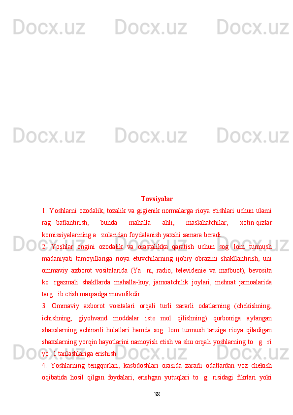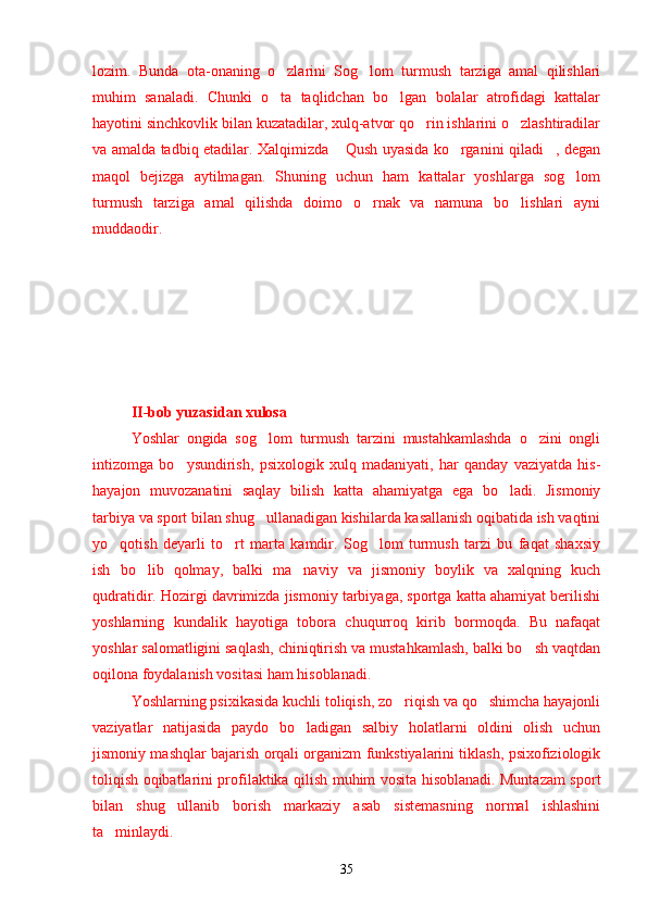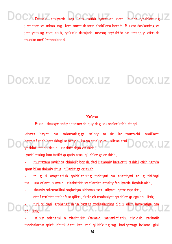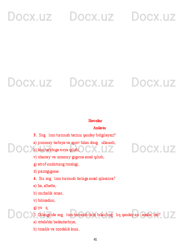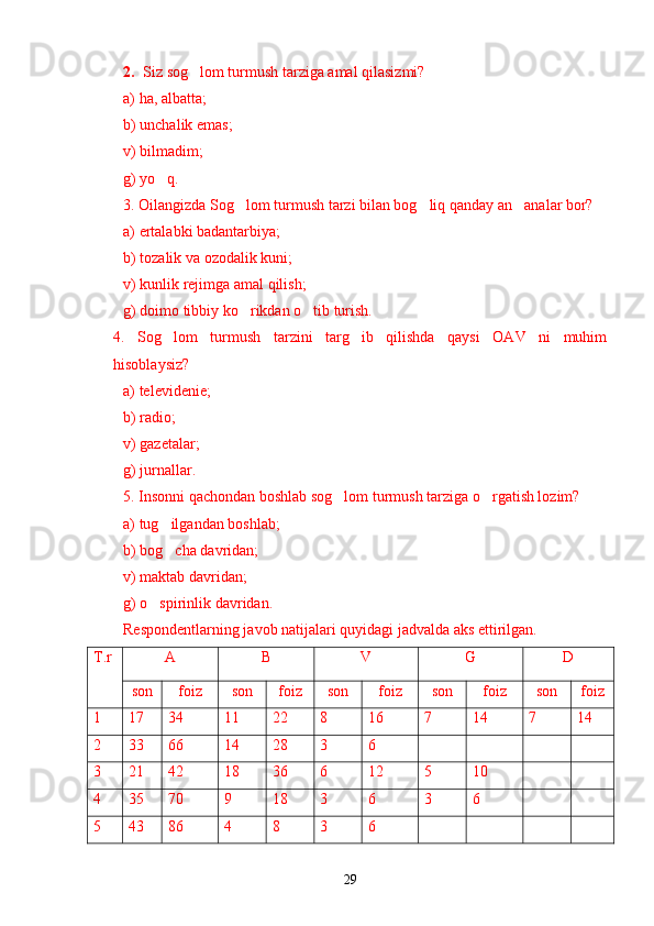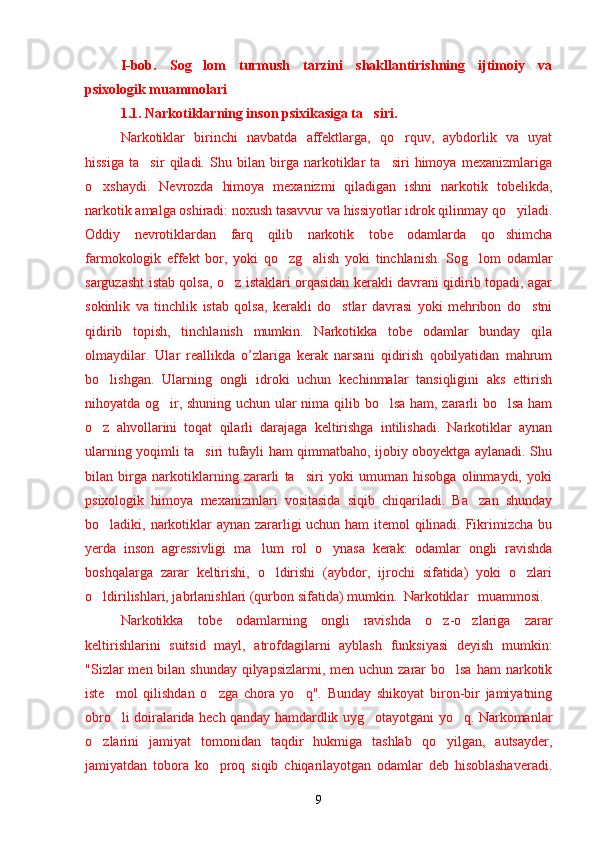 Yoshlar o'rtasida sog'lom turmush tarzini shakllantirishning psixologik omillari Sog`lom turmush tarzini shakllantirishning ijtimoiy va psixologik muammolari Narkotiklarning inson psixikasiga ta`siri Zararli odatlar va ulardan saqlanishning yo`llari O`z-o`zini tarbiyalash asosida sog`lom turmush madaniyatini rivojlantirish Yoshlarda sog`lom turmush tarzining ijtimoiy-psixologik xususiyatlarini o`rganish natijalari Yoshlarning sog`lom turmush tarzi haqidagi fikrlari Yoshlar hayotida sog`lom turmush tarzini barqarorlashtirish usullari
