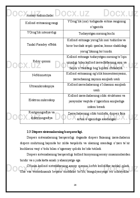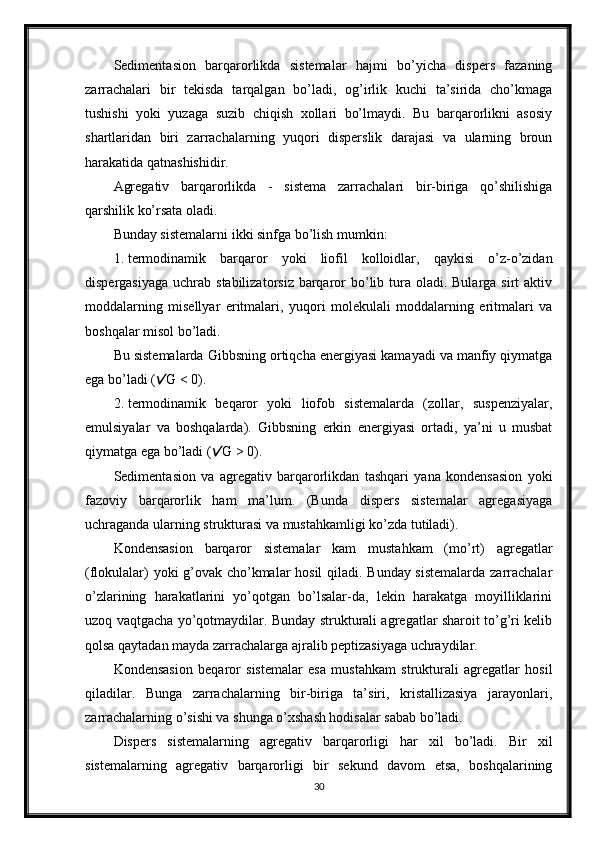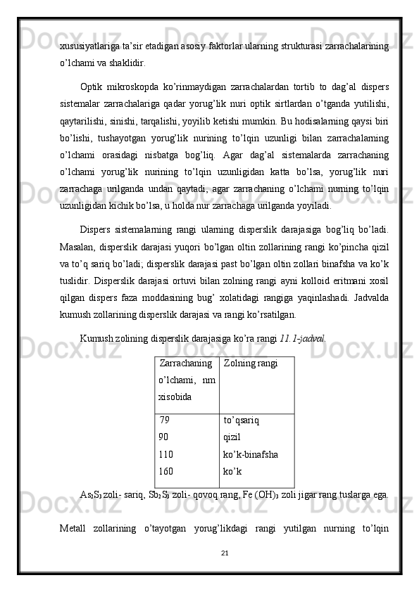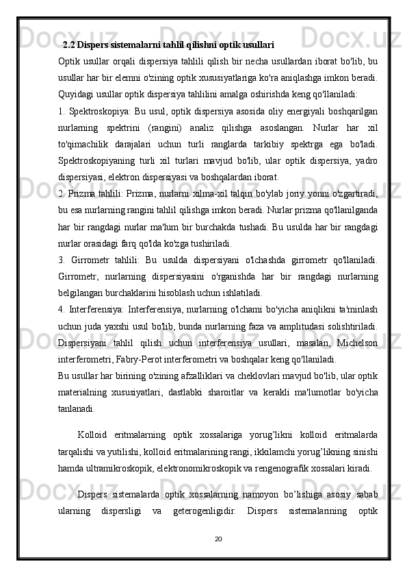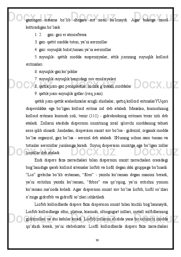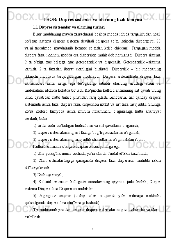 Yuqori dispersli dispers sistemalarning o’ziga xos xususiyatlari