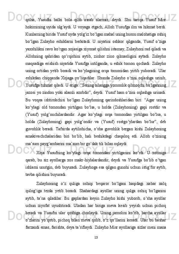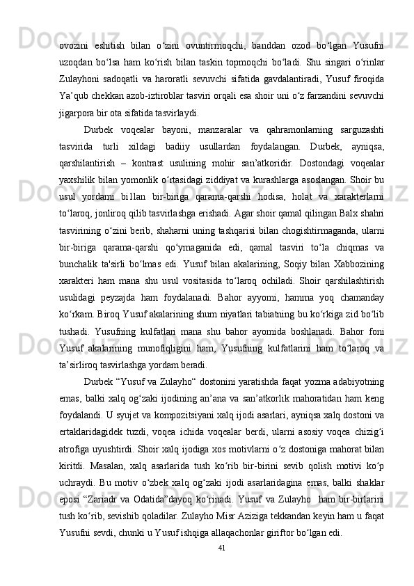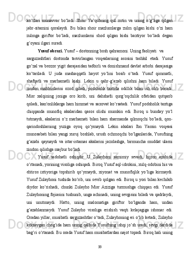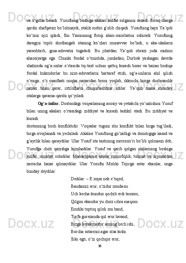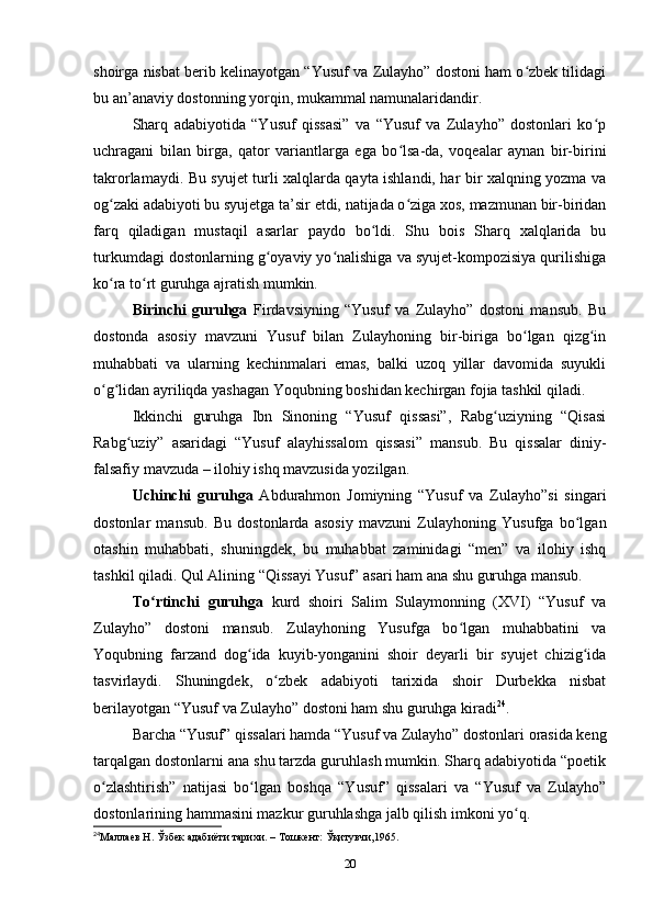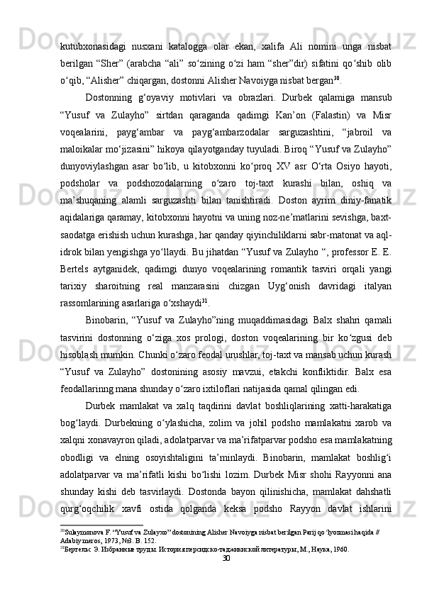 2.2. XIV asrga oid “Yusuf va Zulayho” dostoni (Durbekka nisbat berilgan)…….27