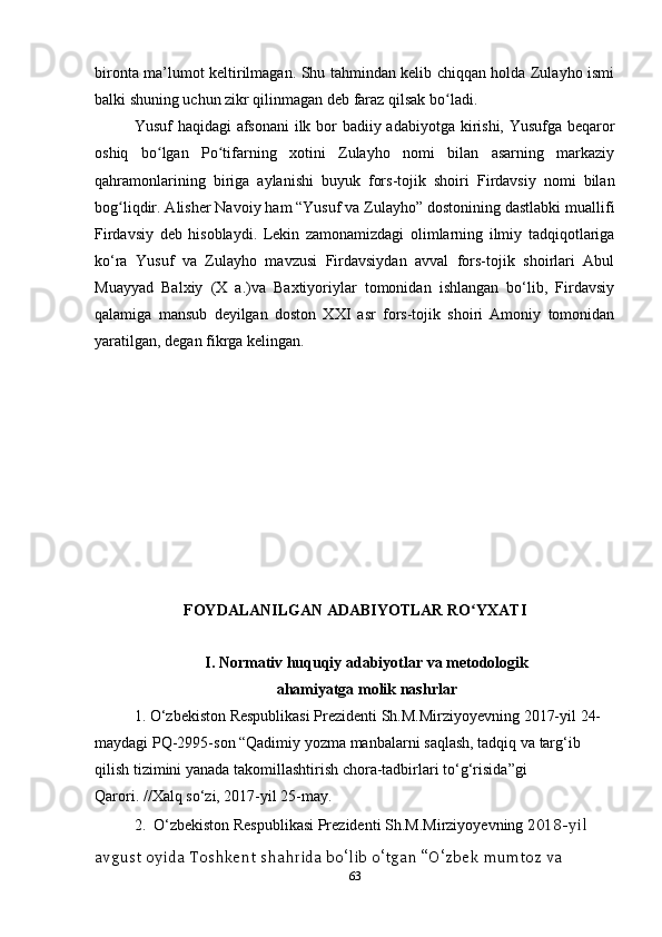 FOYDALANILGAN ADABIYOTLAR ROʻYXATI………………………….63