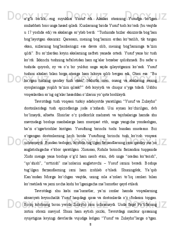 1.2. Qur’oni Karim va islom dini manbalarida Yusuf qissasi………………………9
