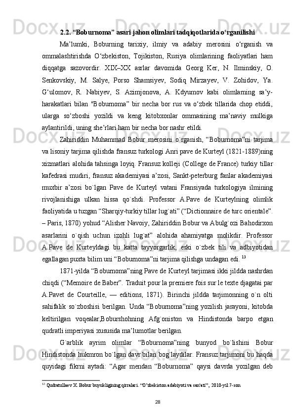 2.2. “Boburnoma” asari jahon olimlari tadqiqotlarida o‘rganilishi 27