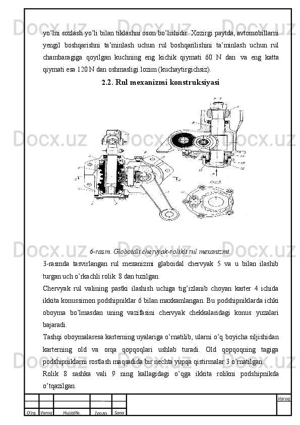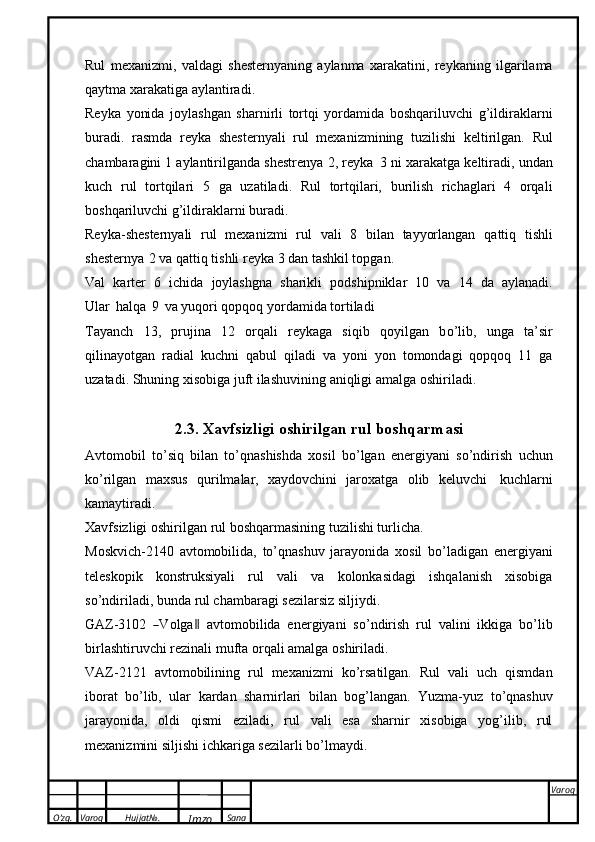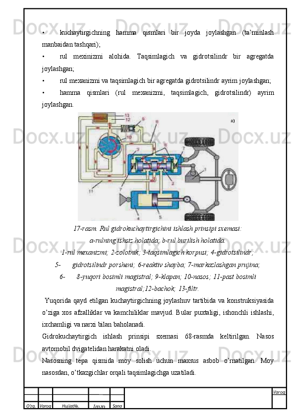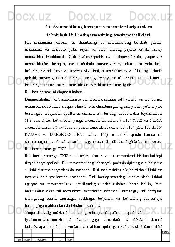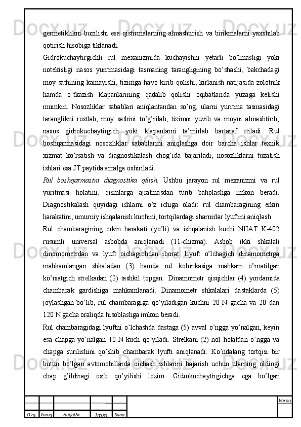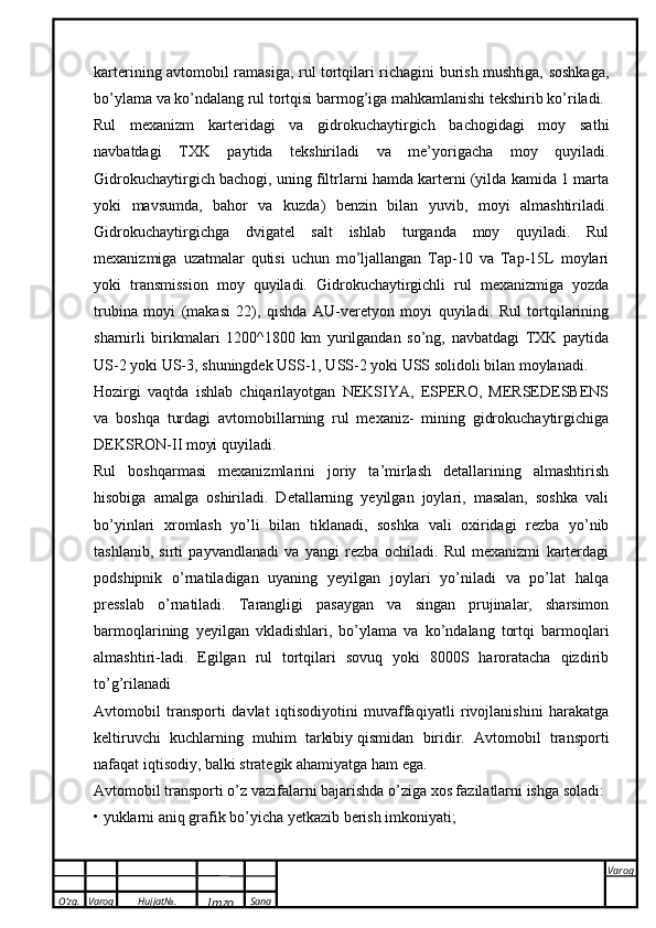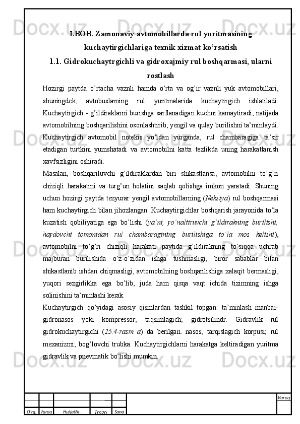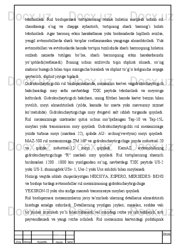 Zamonaviy avtomobillar rul yuritmasining kuchaytirgichlariga texnik xizmat ko’rsatish