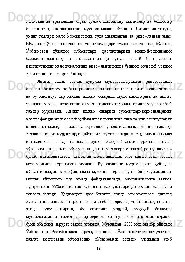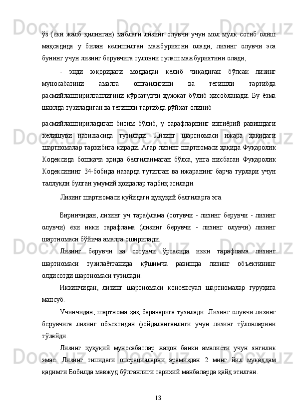 Ўзбекистон Республикасида лизинг муносабатлари ҳуқуқий асослари ва уларни такомиллаштириш