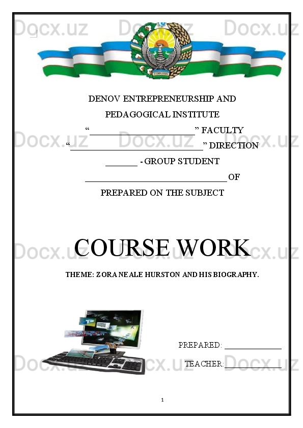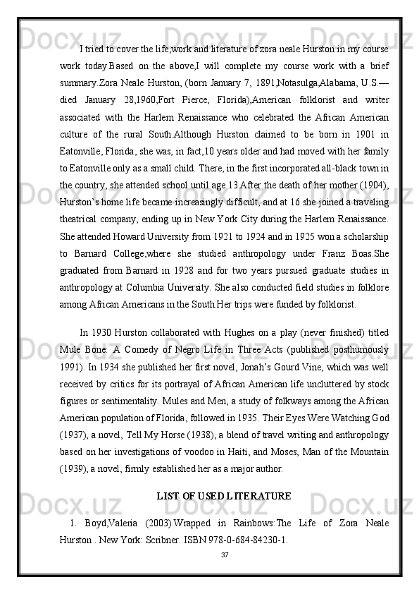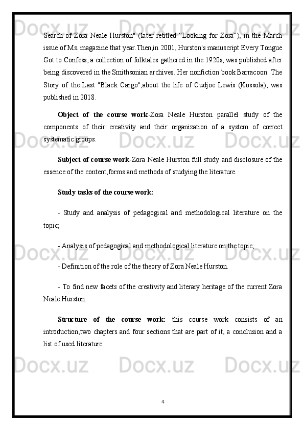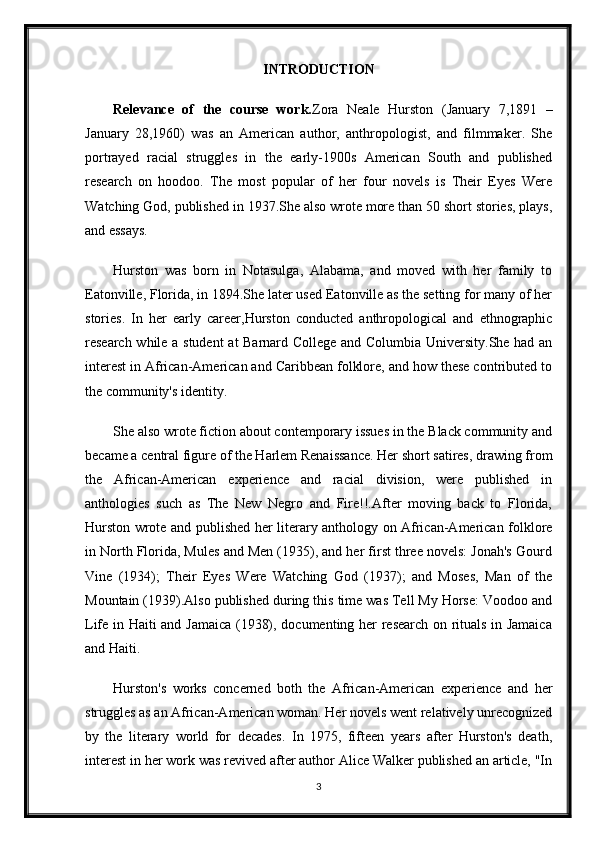 Relevance   of   the   course   work. Zora   Neale   Hurston   (January   7,1891   –