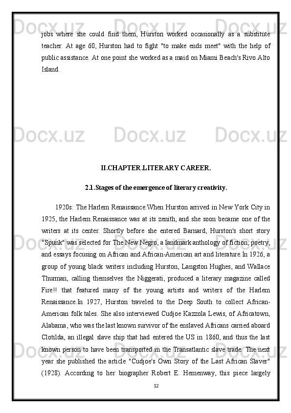3 jobs   where   she   could   find   them,   Hurston   worked   occasionally   as   a   substitute