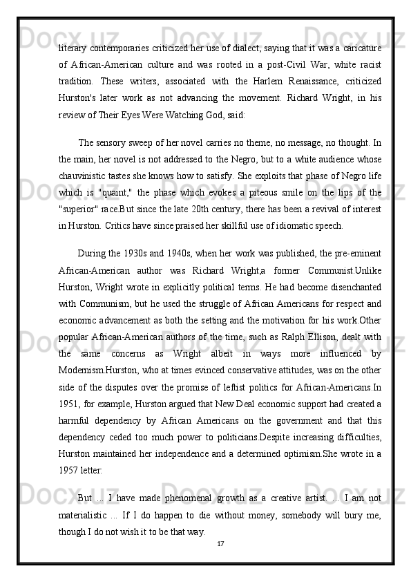 criticizing   her   novel   Their   Eyes   Were   Watching   God   for   not   exploring   racial