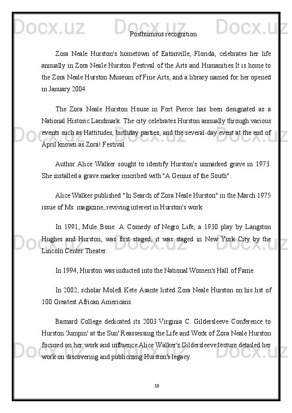 by   the   literary   world   for   decades.   In   1975,   fifteen   years   after   Hurston's   death,