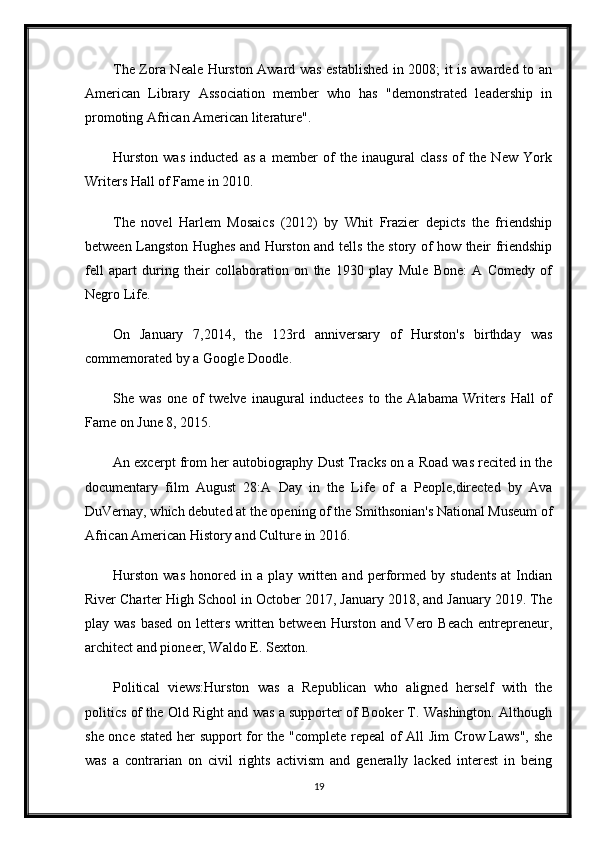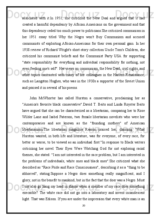 John   McWhorter   has   called   Hurston   a   conservative,   proclaiming   her   as